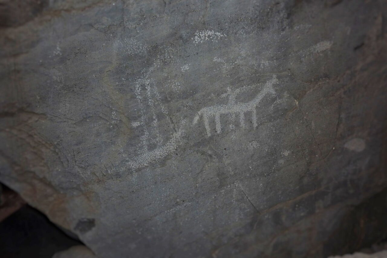 Genau auf der anderen Straßenseite, gänzlich unscheinbar und ohne Markierung, sind direkt am Straßenrand die 2.000 Jahre alten Felszeichnungen mit Tieren und Kriegern zu sehen.