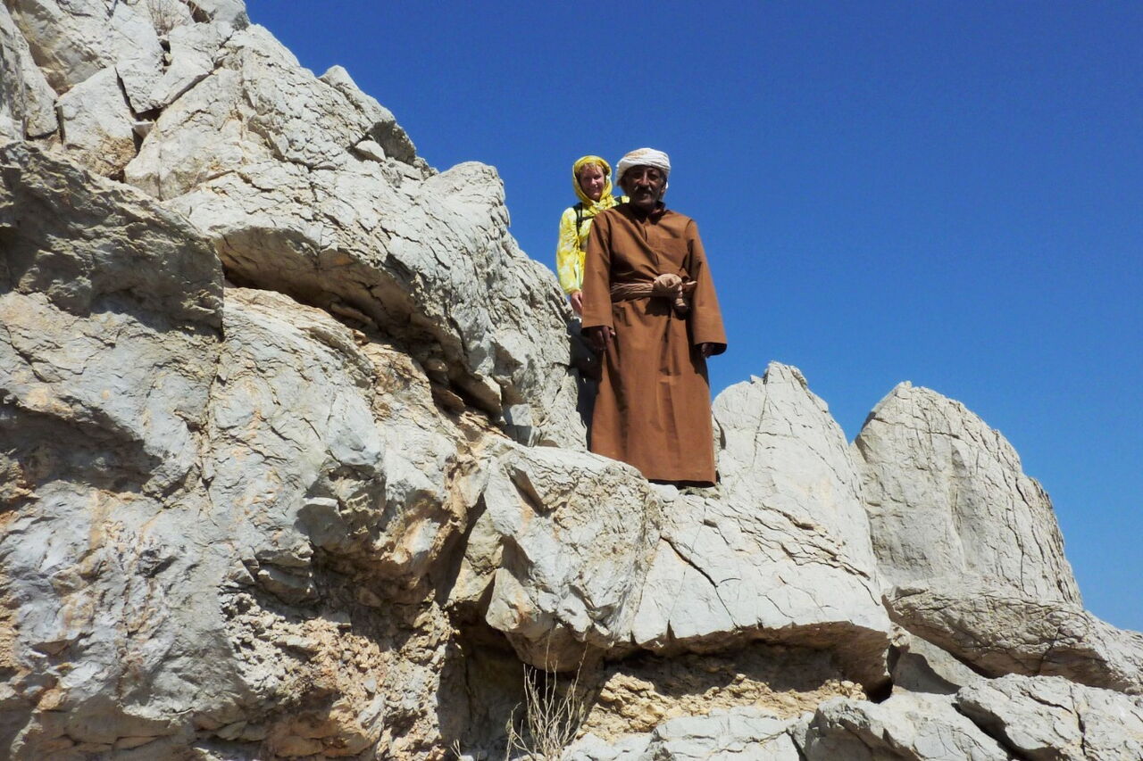 Uns hat ein Omani, der Fischschwärme seinen Kollegen auf dem Meer meldet, den Weg gezeigt. Als Orientierungshilfe gehen auch die blanken Steine vom vielen Klettern.