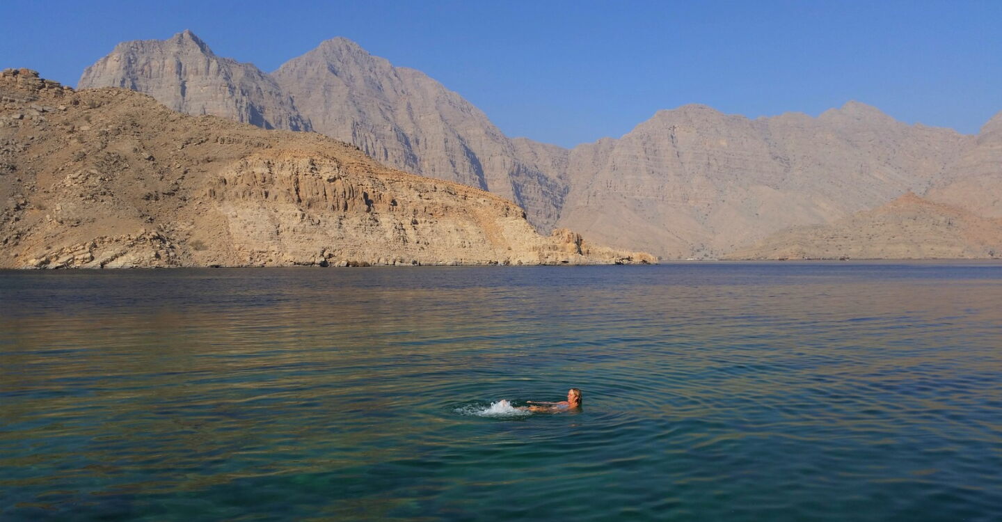Vom Hafen aus fahren wir erst noch kurz auf der Straße von Hormus. Von hier sind es 65 km zum Iran, bis wir dann in den traumhaft schönen Chaur-asch-Scham-Fjord eintauchen.