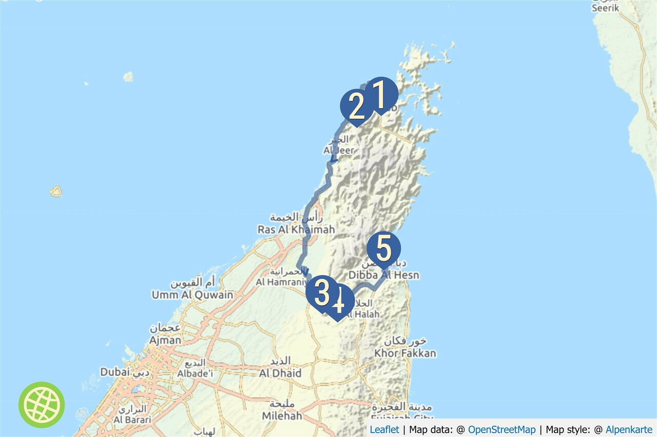 Das nur 60 Fahrtminuten von Dubai entfernte Emirat Ras al Khaimah, mit seiner gleichnamigen Hauptstadt, ist nicht vom Gigantismus Dubais angesteckt worden. Nur vereinzelte Hotels verteilen sich auf den 70 km langen Küstenabschnitt. Leider fehlt es jeglicher touristischer, obwohl es weitaus mehr Sehenswürdigkeiten als in Dubai gibt. Aber östlich des Emirats befinden sich die Ausläufer des Hajargebirgsmassiv. Hier erwartet Sie eine spannende Wanderung durch eine unberührte Bergwelt. Dabei führt ein uralter Pfad durch ein abgelegenes Tal und einsam gelegenes Dorf. Eine abenteuerliche Offroadfahrt durch ein Wadi rundet diesen erlebnisreichen ab.