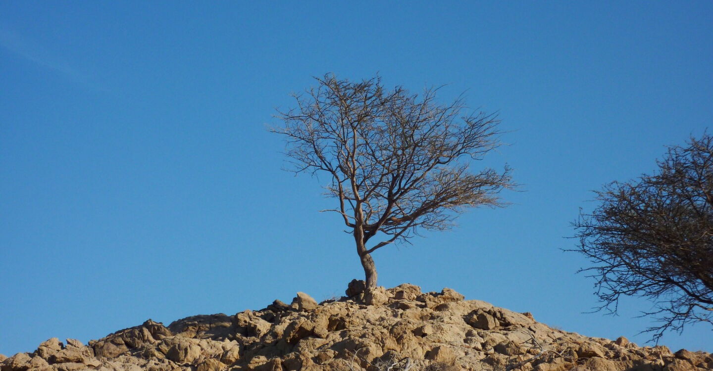 Ab hier ist ein Pfad zu erkennen, der nur leicht an Höhe verliert und ca. 600 m quer durch den links liegenden Hang führt, bis wir an eine weitere Wasserscheide kommen, wo rechts ein paar Akazien erhöhter stehen.