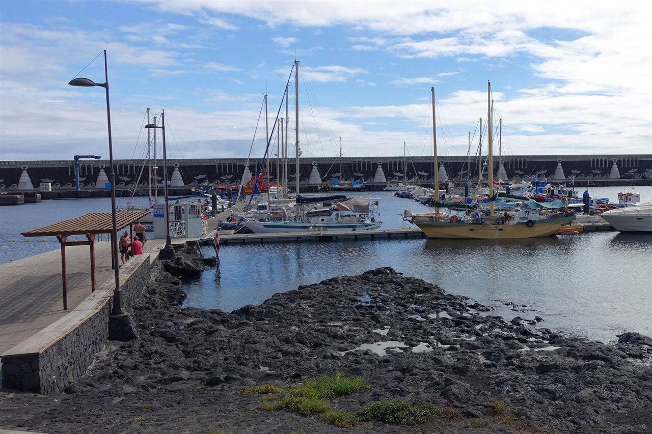 Eine Piste zu einem links stehenden Einzelhaus ignorieren wir und gehen geradeaus weiter. Hinter einer Senke gabelt sich die Piste. Wir gehen halb links und im weiteren Verlauf vorbei an der Montana La Restinga, die sich rechts von uns befindet. Hinter der Entsalzungsanlage halten wir uns halb links in Richtung eines Strommasts und gehen dann auf dem Pfad bis zur Bushaltestelle an der Hauptstraße von (05) La Restinga (17 m). Gleich mehrere Straßen führen herunter zu den Fischrestaurants und der Promenade.