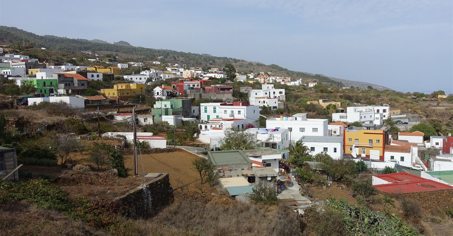 Vom (01) Start und Ziel (823 m) am Busbahnhof wandern wir auf der Anfahrtsstraße zurück, um direkt vor dem Dorfplatz in die Einbahnstraße Calle El Chamorro zu biegen. Bei einem Heiligenschrein gabelt sich die Straße und wir gehen halb rechts bergauf. Bei der nachfolgenden großen Kreuzung gehen wir halb links am Barranco entlang. An der nachfolgenden Kreuzung gehen wir weiterhin geradeaus auf dem Camino El Pinar. Wir erreichen eine Weggabelung, halb rechts geht es zur Aula de la Naturaleza. Wir gehen halb links in den Pinienwald und folgen den aus Lavastein gemauerten Markierungen. Bei der darauffolgenden Weggabelung folgen wir weiterhin dem Camino El Pinar. Einen mit Steinen gesäumten Pfad nach rechts ignorieren wir.