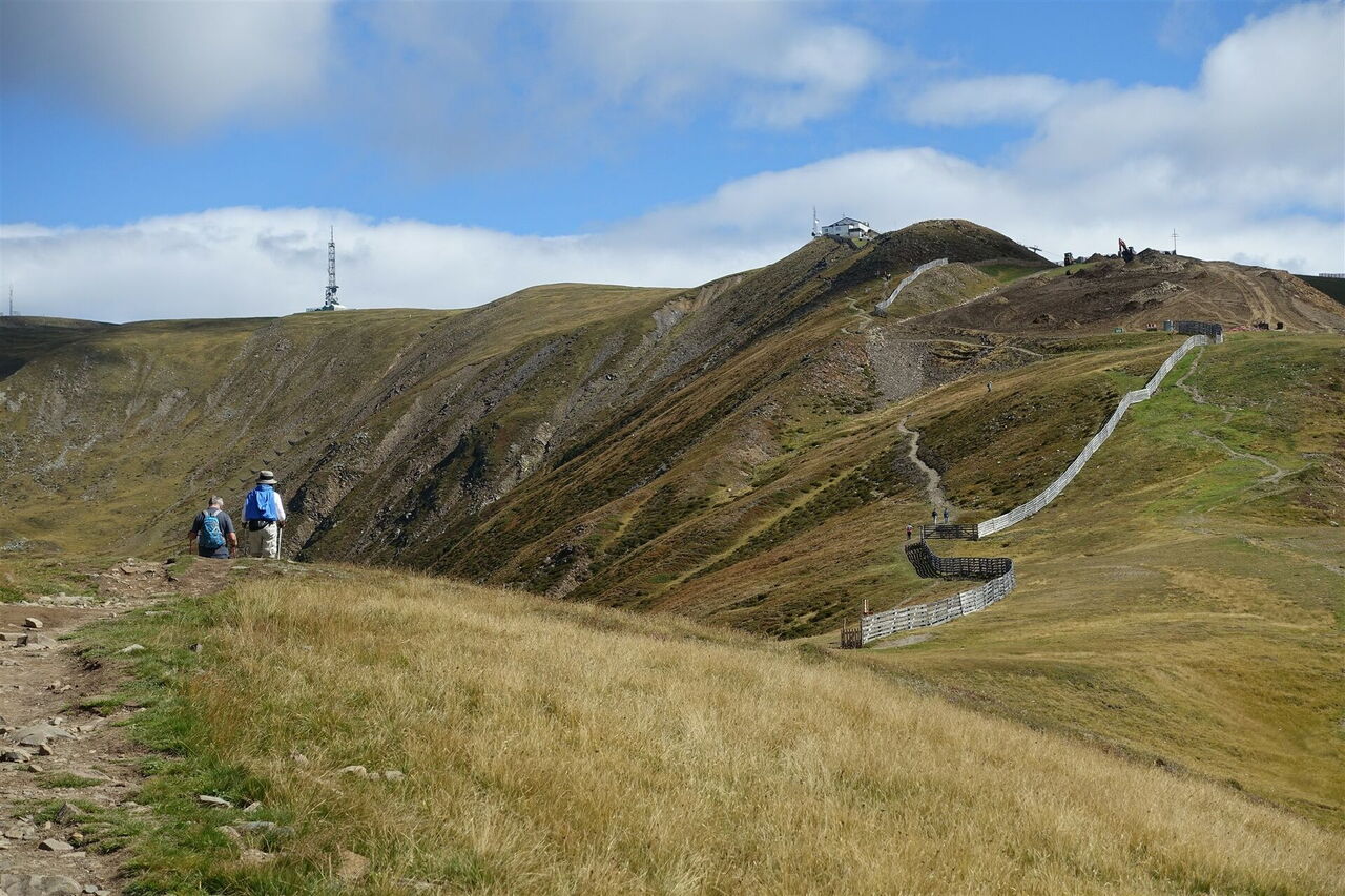 Hinter dem Gebäude der 02 Bergstation der Plose-Kabinenbahn (2.050 m) gehen wir gleich scharf links und dann ein kurzes Stück entlang des Brixner Höhenweges – der Wanderweg 7, auch ausgeschildert Richtung Plose.