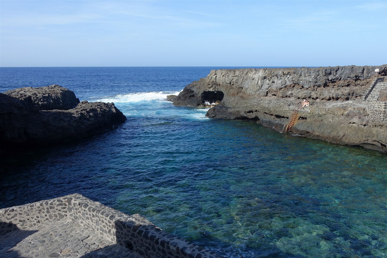 70 m westlich befindet sich das Badebecken (04) Charco Manso (2 m). Nach einem erfrischenden Bad oder einer Brotzeit oder beidem gehen wir zunächst auf der Zubringerstraße und dem Camino Viejo de Las Salinas zurück. Wir kommen an der Stelle vorbei, wo der Hinweg in die Straße mündet. Nach 90 m, in der Rechtskehre, verlassen wir die Straße geradeaus auf dem bergauf führenden Pfad. Gelb-weiße Markierungen und die Ausschilderung Richtung Echedo vereinfachen die Navigation. Entlang von Weinstöcken erreichen wir das Dorf Echede.