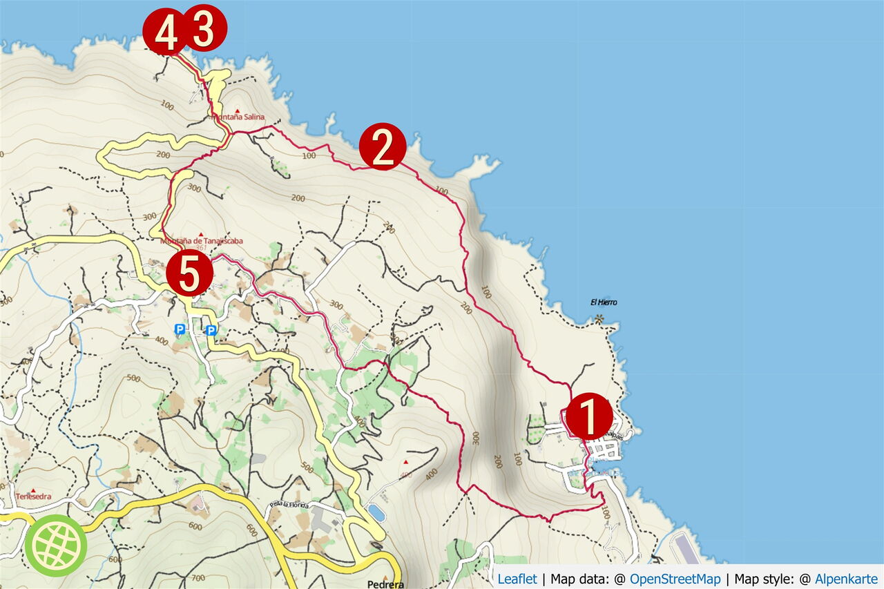 Vom (01) Start und Ziel in Tamaduste (24 m) gehen wir die Zielstraße bergauf, bis sie endet, um dort links zu gehen und dem Straßenverlauf durch die Rechtskurve zu folgen. Die Straße biegt nach 160 m scharf rechts ab, während wir geradeaus auf der beginnenden Piste weitergehen. Die Schotterpiste gabelt sich und wir halten uns auf dem linken Abzweiger. Während wir an den ausgelagerten Müllresten von Tamaduste vorbeikommen, sollten wir die Möglichkeit nutzen und den Blick entlang des links von uns liegenden Montana Del Pico in die Ferne schweifen lassen. Oberhalb lässt sich eine Ruine ausmachen. Diese erreicht man über einen gut zu erkennenden Pfad, der den Hang bergauf führt. Das ist unser Weg für den Aufstieg. Später ist die Piste kaum noch auszumachen. Der nachfolgende Pfad gabelt sich, während wir halb links steil über rutschiges Geröll zu einem Steinmännchen aufsteigen.