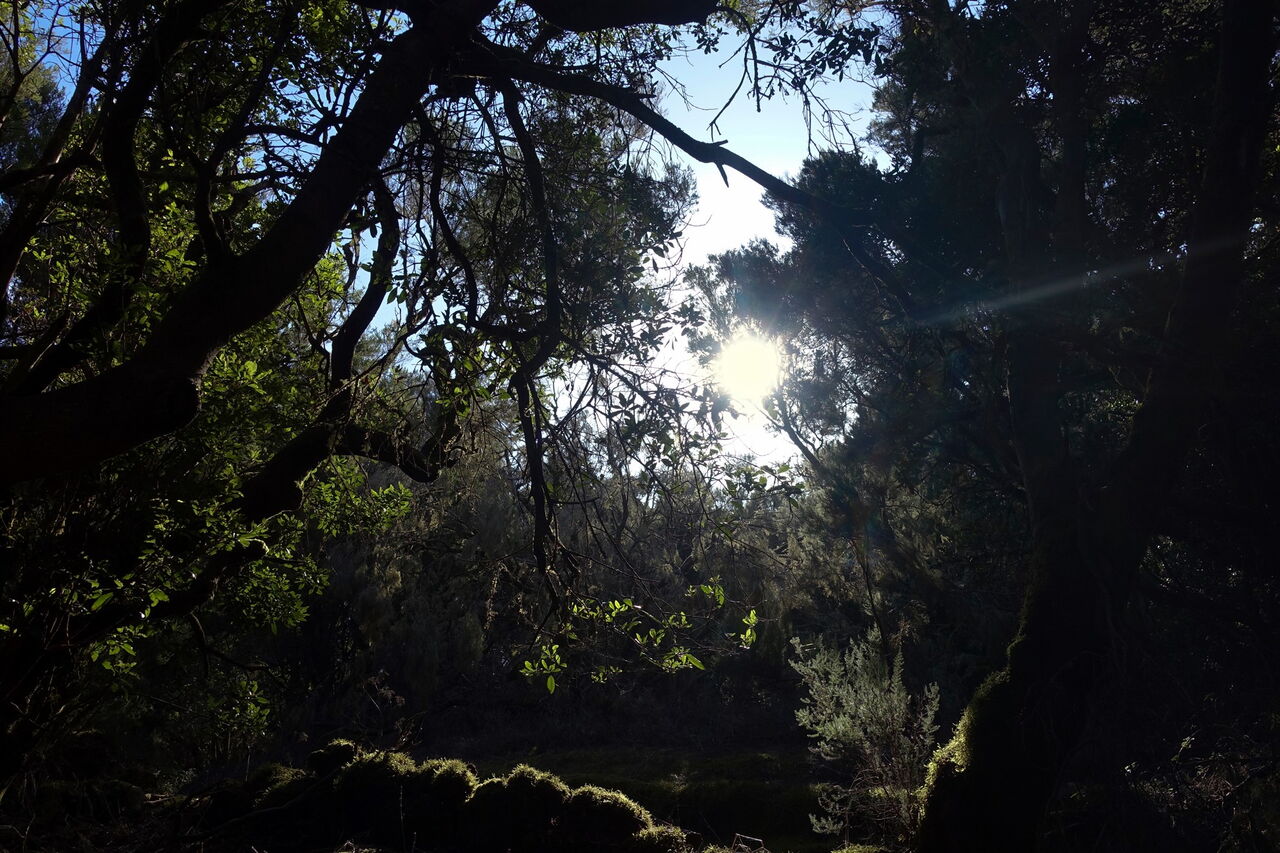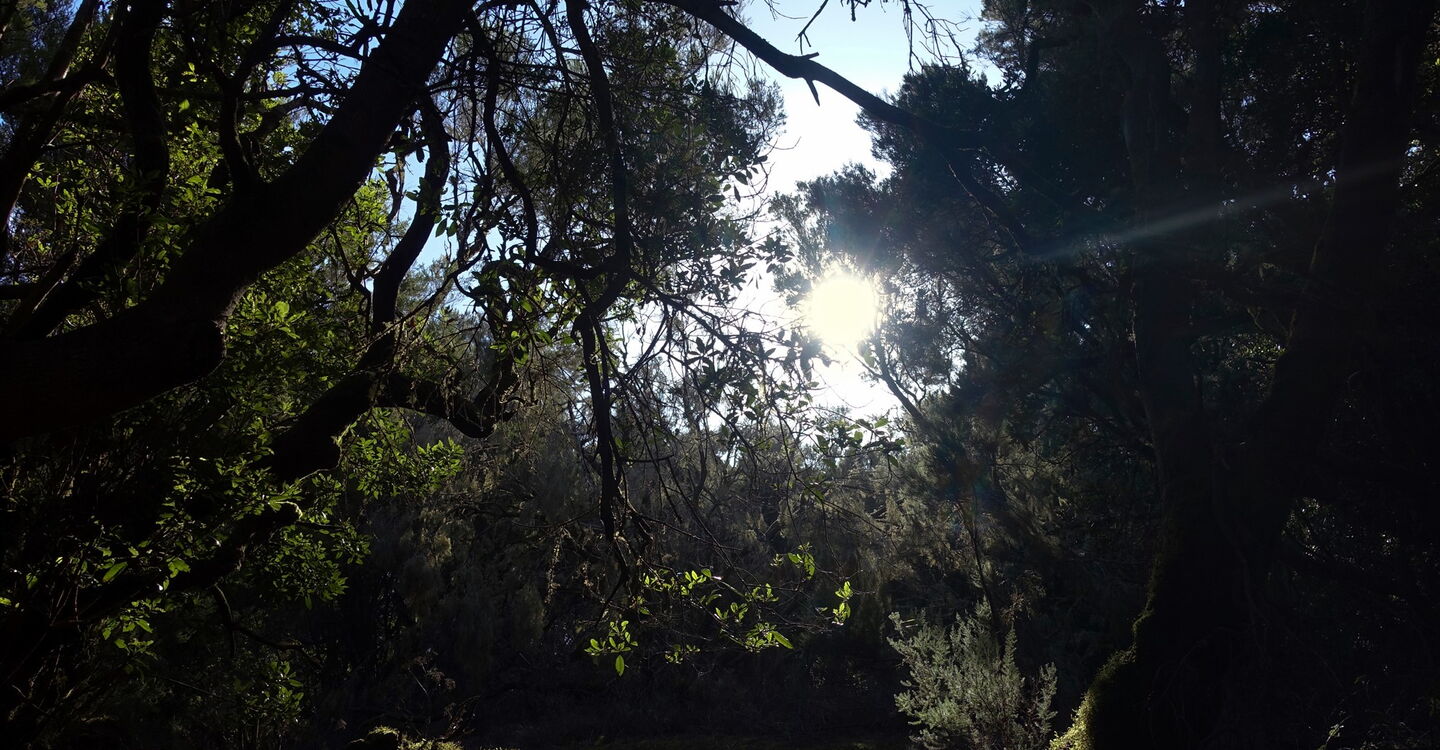 Nach 3,4 km zweigt scharf links der (02) Camino Sabinosa (794 m) ab. Auf laubgefedertem Untergrund geht es in Kehren kontinuierlich bergauf. Auch auf dieser Wanderung gilt: Achtung vor den hüfthohen maulbeerblättrigen Brennnesseln, sie sind nachhaltig schmerzhaft! Wir lassen die Vegetationsstufe des immergrünen Nebelwalds hinter uns und erblicken Kanarische Kiefern am Wegesrand. Der Wanderweg führt über feines Lapilli-Gestein und kurz später über lange, vertrocknete Tannennadeln.