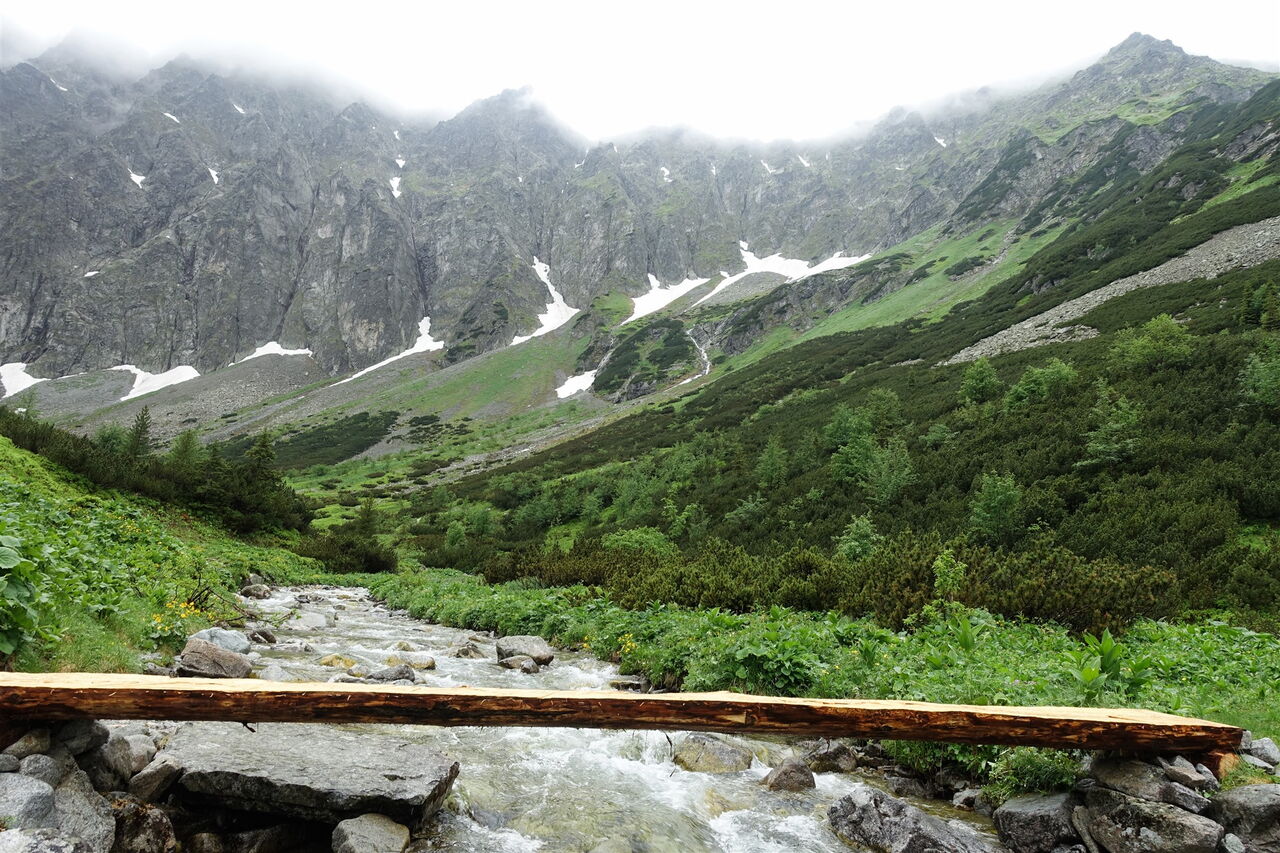 Nachdem wir zwei Bachläufe überquert haben, steigen wir dann auf einem mit Felsen verlegten Pfad talwärts in das 8 km lange 04 Javorová Dolina (1533). Durch ein ursprüngliches und gottverlassenes Tal gelangen wir zu einem romantisch gelegenen See, rechts und links ragen majestätisch die Berggipfel in die Höhe. Auf einem halbierten Baumstamm wird der Bachlauf gequert. Wir gehen dann immer parallel zum Bachlauf und kommen an einer vereinzelten Hütte vorbei.