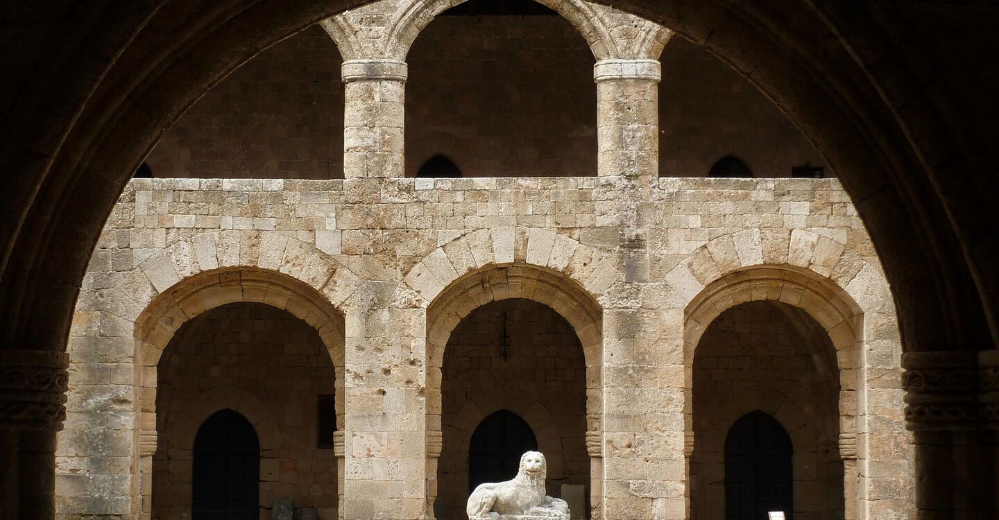 Wir setzen unseren Weg parallel zur Stadtmauer fort, gehen durch das Arnaldotor, und bevor wir den historischen Stadtkern ganz verlassen, gehen wir links direkt auf das (03) Archäologische Museum (4 m) zu, das ehemalige Ordenshospital der Johanniterritter. Es wird auch das Krankenhaus der Könige genannt und wurde in der Zeit von 1440-1484 errichtet – eines der herausragenden Gebäude der Ritterzeit. Seit 1916 dient es als Museum und es werden Exponate aus der postklassischen, hellenistischen, römischen und Ritterzeit gezeigt. Vor dem Gebäude gehen wir rechts und dann sofort links in die äußerst beeindruckende gepflasterte Ritterstraße – Griechenlands einzige vollständig erhaltene Wohnstraße aus dem 16. Jahrhundert.