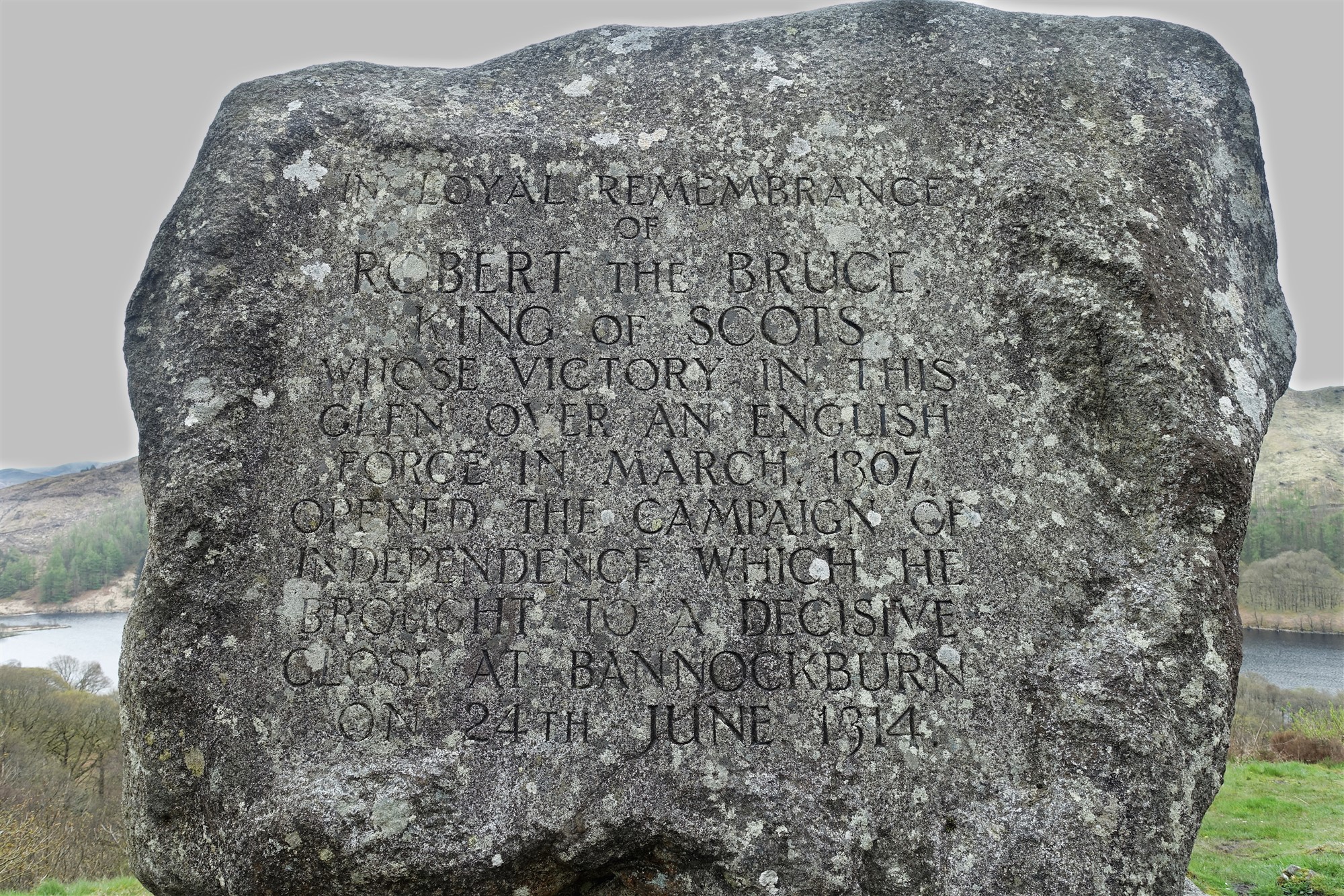 Bevor wir mit der Wanderung beginnen, machen wir noch einen lohnenswerten Abstecher zu dem 1929 errichteten 01 Bruce's Stone (138 m). Dieser Gedenkstein erinnert an die Schlacht, in der Robert the Bruce mit nur 300 Mann eine englische Armee von 1500 schweren Kavalleristen besiegte. Robert the Bruce war von 1306 bis zu seinem Tode 1329 König von Schottland. Dieser erste Kriegsakt war auf lange Sicht der erste Versuch der Engländer, Schottland mächtig zu werden, aber zugleich auch bis heute der letzte Sieg der Schotten über die Engländer.
