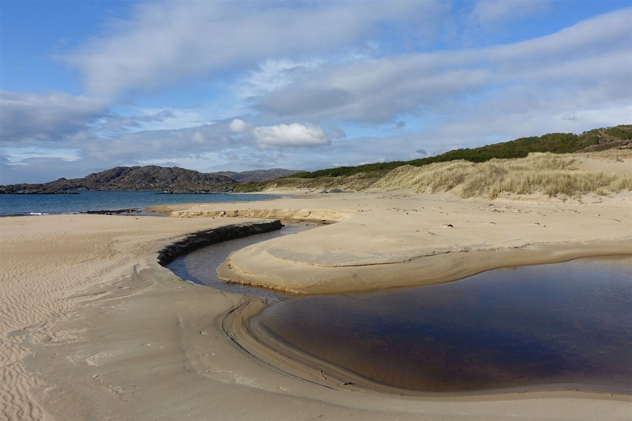 Die Kentra Bay auf der Halbinsel Ardnamurchan ist geprägt von Salzwiesen, versteckt liegenden goldgelben Sandstränden und eindrucksvollen Sanddünen. Der Wanderweg führt durch eine Waldplantage zum schönsten aller Strände auf dieser Runde, ein magischer Kraftort und mit einer atemberaubenden Aussicht auf die kleinen vorgelagerten Inseln. Es gibt die Möglichkeit, Wattvögel zu beobachten, und mit etwas Glück kann man Seeadler, Seidenreiher, Robben oder Otter entdecken.