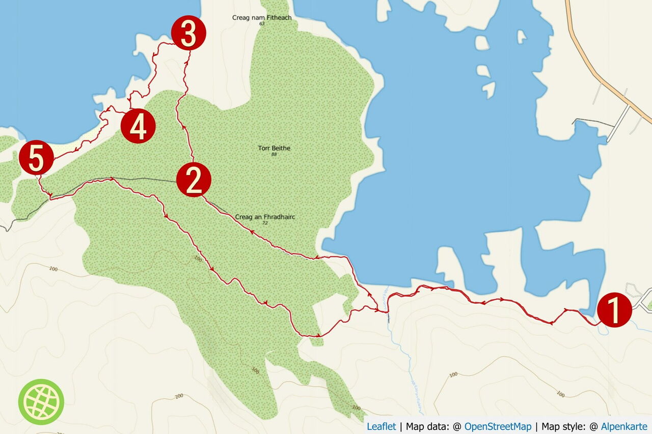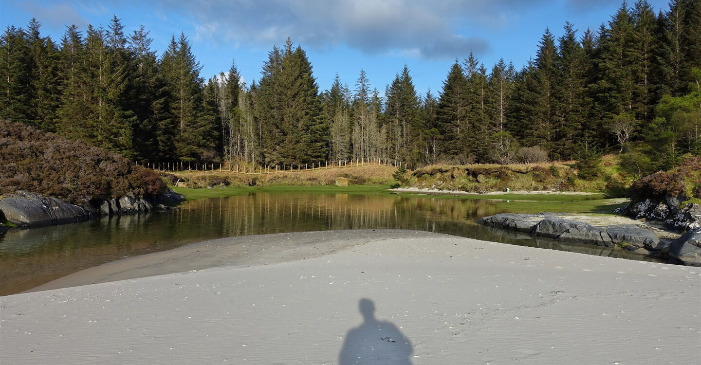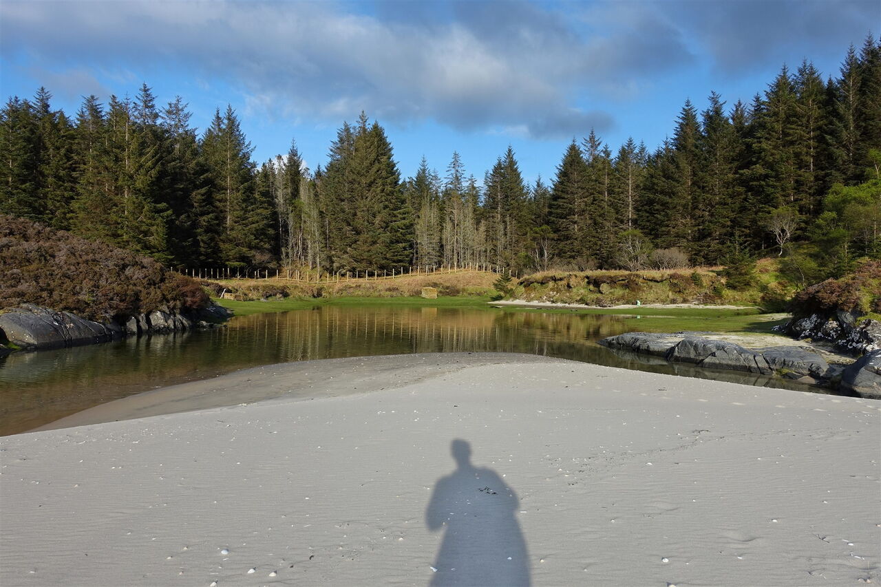 Vom 01 Parkplatz (2 m) am Ende der Straße zum kleinen Ort Arivegaig folgen wir dem weiterführenden Weg über die Brücke entlang der südlichen Kentra Bay. Wir überqueren eine Holzbrücke und ignorieren den Pfad, der links zu einer Wasserkraftanlage aufsteigt. Dann gehen wir direkt auf ein Gatter zu – durch dieses kommen wir auf dem Rückweg. Hinter den zwei Steinhäusern des Dorfes Gorteneorn folgt ein schöner Wegabschnitt durch eine Waldplantage.