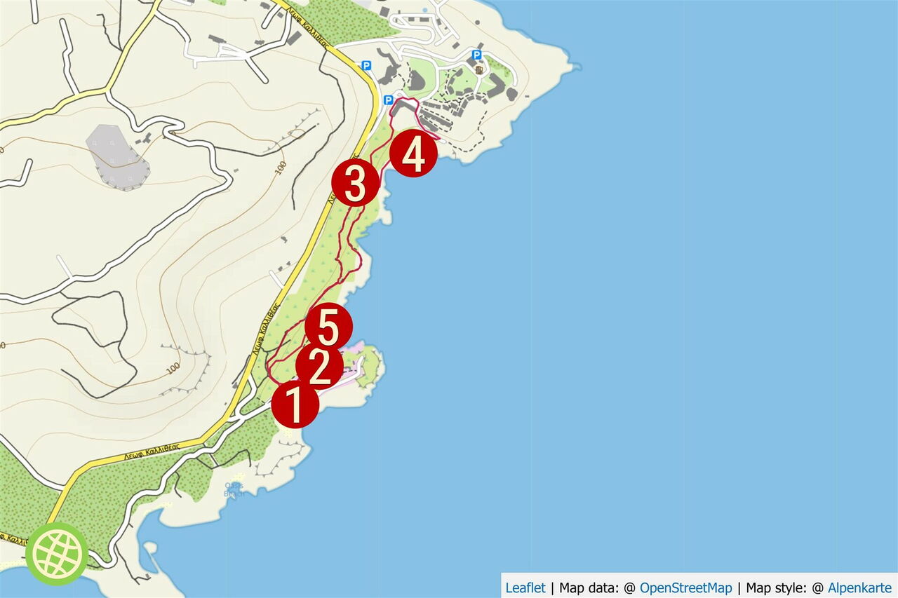 Einfache Wanderung auf gerölligem Untergrund. Zwischen dem Wegpunkt 4 und dem Wegpunkt 3 befindet sich eine Kletterstelle; daher der Schwierigkeitsgrad rot, sonst wäre er blau. Art des Weges: 20 % Schotterpiste, 50 % Pfade und 30 % angelegte Wege. Ausrüstungsempfehlung: Die Badehose nicht vergessen. Einkehr: die Taverne Pane Di Capo direkt auf dem Gelände bei der Therme. Beste Jahreszeit für diese Tour: April bis Oktober. Variante: Möchte man nicht über das Gelände des Kalithea Mare Palace Hotels und den nachfolgenden Strand, gefolgt von einer kleinen Kletterpartie, gehen, so dreht man bereits beim Wegpunkt 4 um.