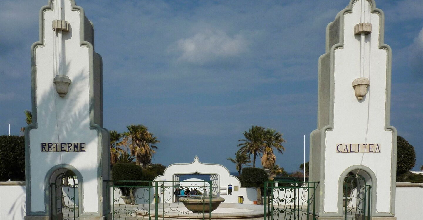Vom (01) Start und Ziel (14 m) gehen wir durch die mächtigen Pfeiler der Eingangspforte, vorbei an einem Springbrunnen, direkt in die Anlage. Die Thermen gehören zu den herausragenden architektonischen Werken der damaligen Zeit. Wege aus Kieselsteinmosaiken führen zum Atrium, von wo das Thermalwasser der 6 Quellen zur Badeanstalt weitergeleitet wird.
