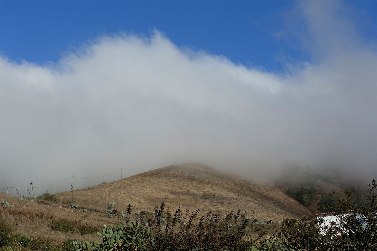 Da der Aufstieg nicht im Einflussbereich der Passatwinde und Passatwolken liegt, kann es um die Mittagszeit extrem heiß werden, auch gibt keine Schatten spendenden Bäume auf dem kräftezehrenden Aufstieg. Hinter einem gelben Haus erreichen wir die betonierte Straße. Wir steigen auf dieser bis zur Verbindungsstraße von San Andres nach Isor auf und überqueren diese. Nach 40 m, hinter einem gelbgrauen Haus mit dunkelbraunen Fensterläden, kann man links abbiegen und so auf eine (04) Variante Richtung San Andres (921 m) gelangen. Das Teilstück ist in der Wanderung 29 unter dem Wegpunkt 05 beschrieben. Wir gehen geradeaus weiter, auch ausgeschildert Richtung Puerto. Nach einem kurzen Stück auf der Hauptstraße verlassen wir diese bereits nach 60 m auf den Abzweiger nach halb rechts.