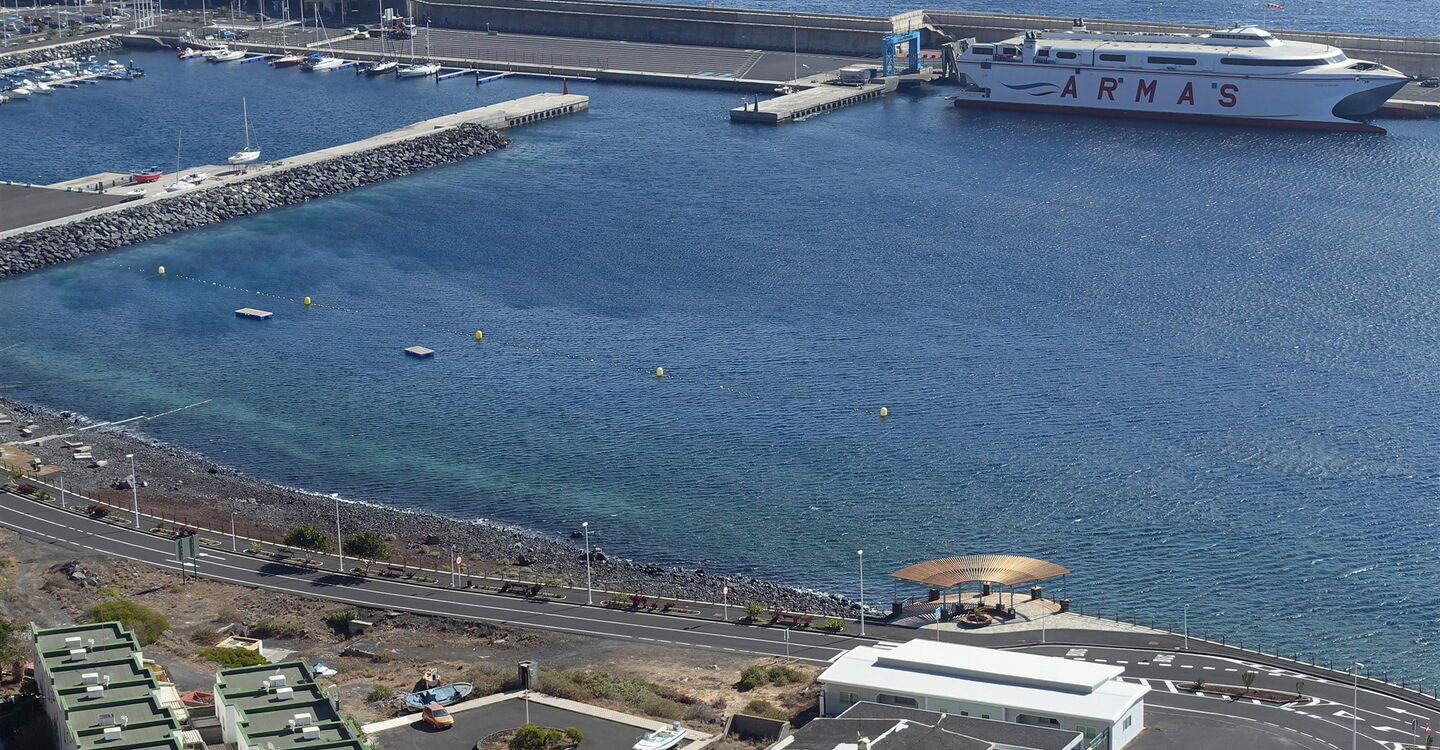 Wir kommen an einem vereinzelten Zedernwacholderbaum vorbei und nach 170 m auf einer Asphaltstraße verlassen wir diese in der ersten Linkskehre. Weiter geht es auf dem geradeaus weiterführenden Camino. Sobald wir links unterhalb eine Ruine mit einem rotbraunen Dach sehen, ignorieren wir auch den linken Abzweiger Richtung Valverde. Oberhalb des Wasserreservoirs vom Wind-Wasserkraftwerk steigen wir im steilen und gerölligen Gelände bis zum Kreisverkehr am (02) Hafen von Estaca (13 m) ab.