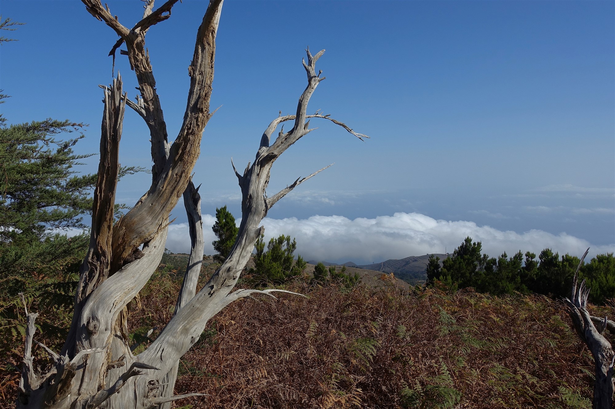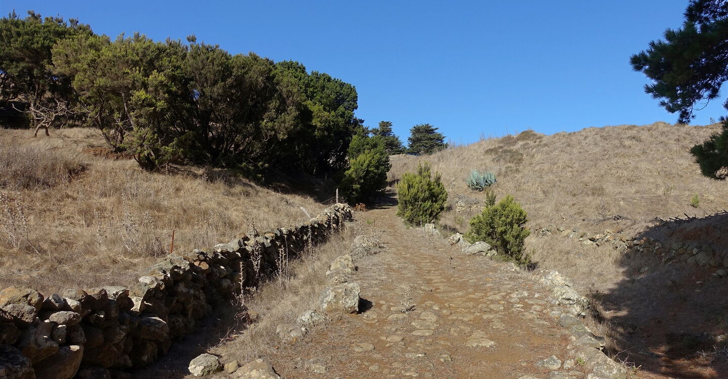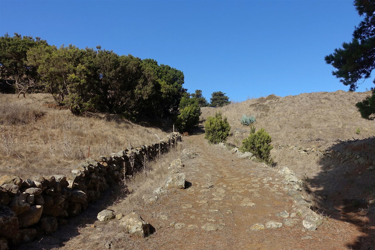 Es folgt ein landschaftlich sehr schönes Wegstück durch einen wohlriechenden Kiefernwald und vorbei an einem künstlich angelegten Wasserreservoir. Der Pfad endet an einer (02) Kreuzung (1047 m), wir gehen geradeaus weiter, auf einem Pfad links entlang einer Mulde. Am Ende der Mulde gehen wir bei der Weggabelung halb rechts, vorbei an Zedernwacholderbäumen. Die Piste wird zu einem mit großen Felsen gesäumten Pfad. Vorbei geht es an einer kleinen Staustufe und durch ein Waldstück, bis wir die Piste erreichen. Nachdem wir 215 m auf dieser bergauf gegangen sind, halten wir uns bei der darauffolgenden Weggabelung halb rechts und ignorieren den linken Abzweiger zum Heiligen Baum Arbol Garoe.