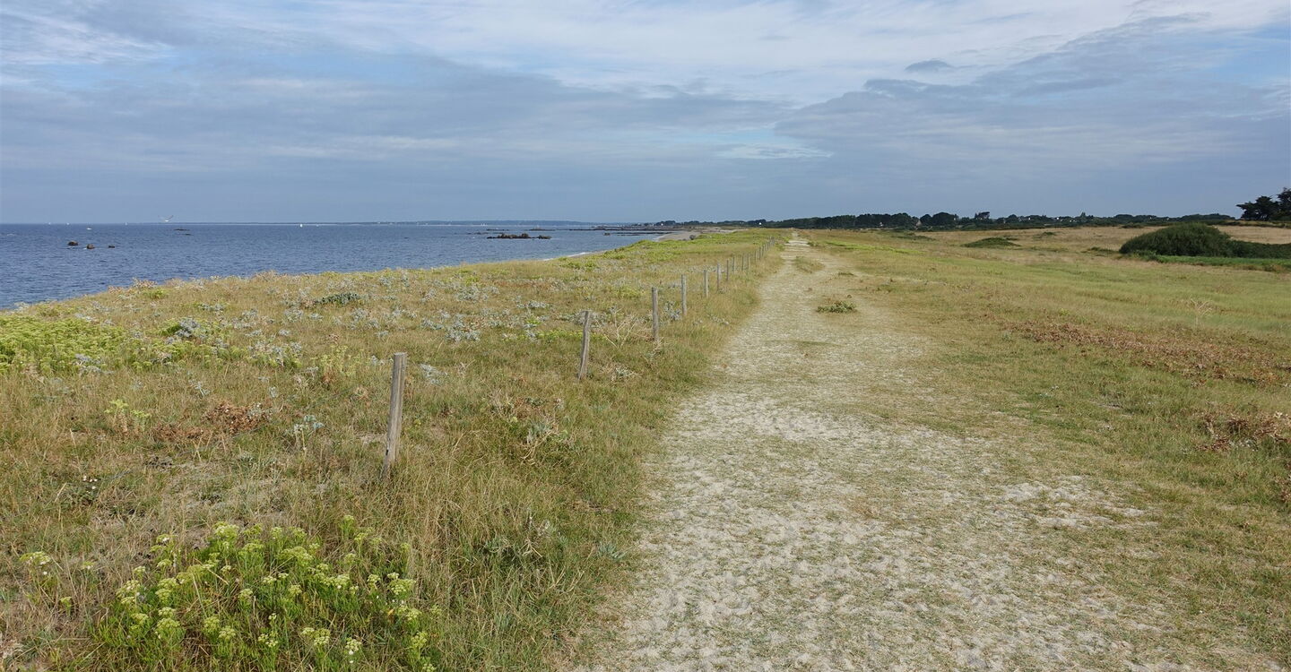 Wir erreichen das Naturschutzgebiet 02 Les Dunes et étangs de Trévignon (6 m) mit seinen Dünen und dem Meer auf der einen und zahlreichen Teichen auf der anderen Seite. Die Flora und Fauna haben es in diesem Lebensraum nicht leicht, denn in den Sommermonaten herrschen hohe Temperaturen mit starker Sonneneinstrahlung und Trockenperioden, während in den Wintermonaten starke Stürme und salzhaltige Luft vorherrschen. Doch Echter Meerkohl, Samtgras, Strandhafer, Wegerich, Schmalblättriger Strandflieder, Strandgrasnelken und die Blaue Stranddistel haben sich an diesen Lebensraum angepasst – hauptsächlich aufgrund ihrer geringen Größe und ihrer Fähigkeit, Wasser zu speichern. Diese typischen Pflanzen der Küste locken eine vielfältige Fauna an, wie z. B. das Schwarzkehlchen, den Steinschmätzer, den Eisvogel, den Fischreiher und den Seestrandläufer auf der Suche nach Nahrung. Auch die Mittelmeersandschnecke, auch Dünenschnecke genannt, oder die Grüne Eidechse finden in der Nähe von Dünen und spärlicher Vegetation ihren Lebensraum. Auf der Seeseite wandern Sanderlinge, Seeregenpfeifer und Steinwälzer durch die Wellen, um Krebstiere und Meereswürmer zu finden. Kormorane sitzen auf den vorgelagerten Felsen und trocknen ihr Gefieder.