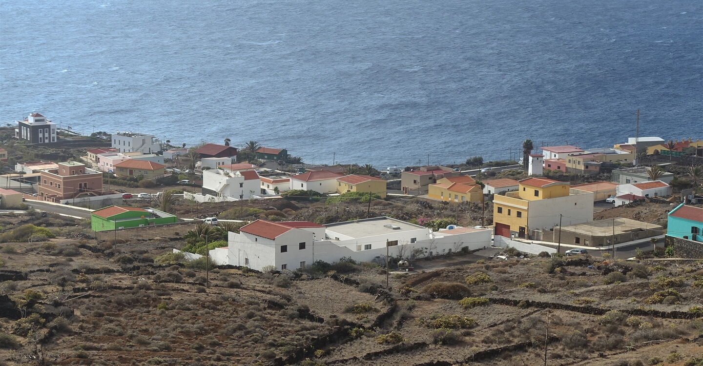 Mit Blick auf das imposante Postgebäude in (01) Valverde (589 m) gehen wir nach rechts und am Gebäude entlang, um bei dem grünen Treppengeländer die Stufen bis zur Straße herunterzugehen. Wir kommen an der kleinen Käsekuchenbäckerei vorbei, queren die nachfolgende Kreuzung und gehen nach 30 m bei der Weggabelung halb rechts – auch ausgeschildert Richtung La Caleta. Auf der Straße zum Flughafen und zum Hafen angekommen, gehen wir 100 m rechts, um dort bei dem Zedernwacholderbaum links auf eine Piste zu gelangen. Diese verlassen wir sofort wieder nach links, bevor die Piste wieder zur Straße hochführt. Vorbei geht es an einem Wassertank und entlang einer oberirdisch verlegten Wasserleitung. Wir überqueren eine weitere, etwas dickere Wasserleitung und gehen hier geradeaus weiter.
