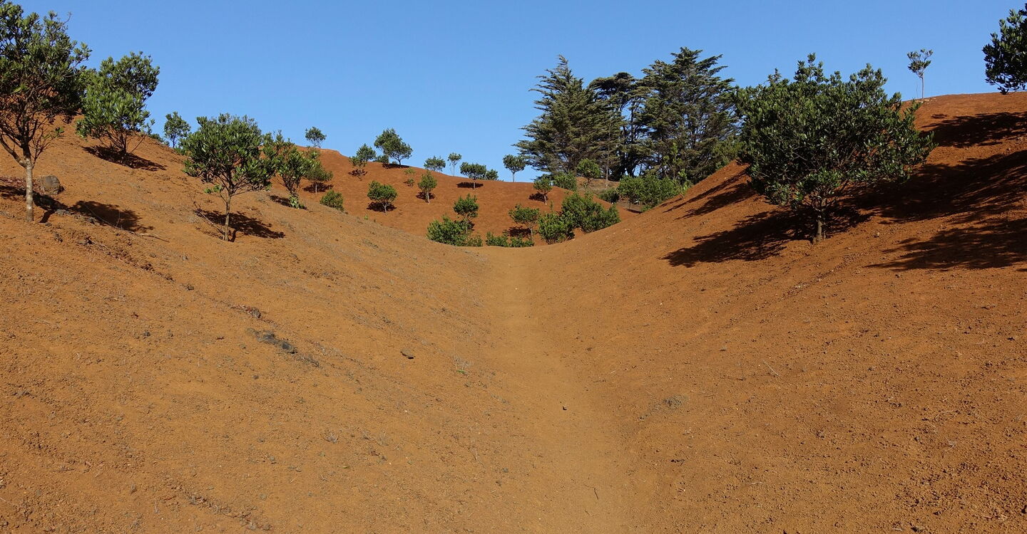 Hinter einer Senke mit Terrassenfeldern ist der Weg kurzfristig mit Steinen gesäumt. Aus dem Pfad wird eine Piste und auf einem halb rechts abzweigenden Pfad erreichen wir eine Wasserstelle mit drei angelegten Wasserreservoirs. An der nachfolgenden Piste gehen wir links bergauf, ignorieren die folgenden zwei rechten Abzweiger und erreichen den Heiligen Baum (03) Arbol Garoe (1032 m). Auf der Anfahrtsstraße zur Sehenswürdigkeit gehen wir bergauf und ignorieren den linken Abzweiger auf der Anhöhe, um dann nach 215 m – oder 50 m hinter einem Bachbett – die Piste nach links zu verlassen. Weiter geht es auf dem Pfad, der durch das kleine Waldgebiet führt.