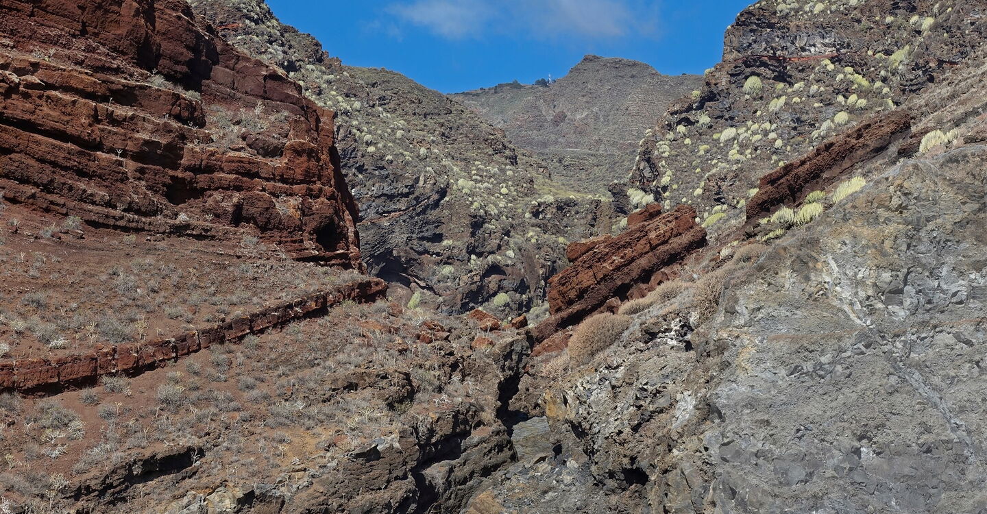 Entlang der schön angelegten Promenade, vorbei an dem Hafen für Kleinboote und dem Playa Del Varadero gelangen wir an einen Kreisverkehr. Direkt auf der gegenüberliegenden Seite findet man den Einstieg zum (04) Aufstieg (16 m). Nach einigen Metern haben wir bereits die Häuser hinter uns gelassen und können halb rechts tief in das wild zerklüftete Barranco de Tinor blicken. Auf gerölligem und steilem Untergrund geht es bergauf. Schon bald sehen wir links unterhalb das untere Wasserreservoir des Wind-Wasserkraftwerks.