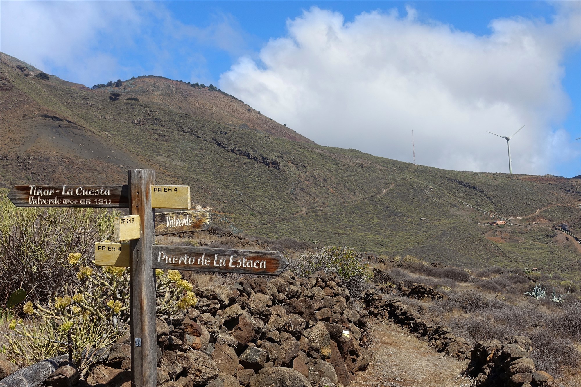 Vom (01) Busbahnhof (616 m) in Valverde gehen wir zur Hauptstraße zurück. Wir gehen weiter auf der ortsauswärts führenden Straße Richtung San Andres und verlassen diese auch gleich wieder nach links, ausgeschildert Richtung Parque Eolico und einige Meter weiter Richtung Puerto de La Estaca. Der Abstieg erfolgt auf dem sogenannten Camino Ancho.