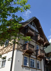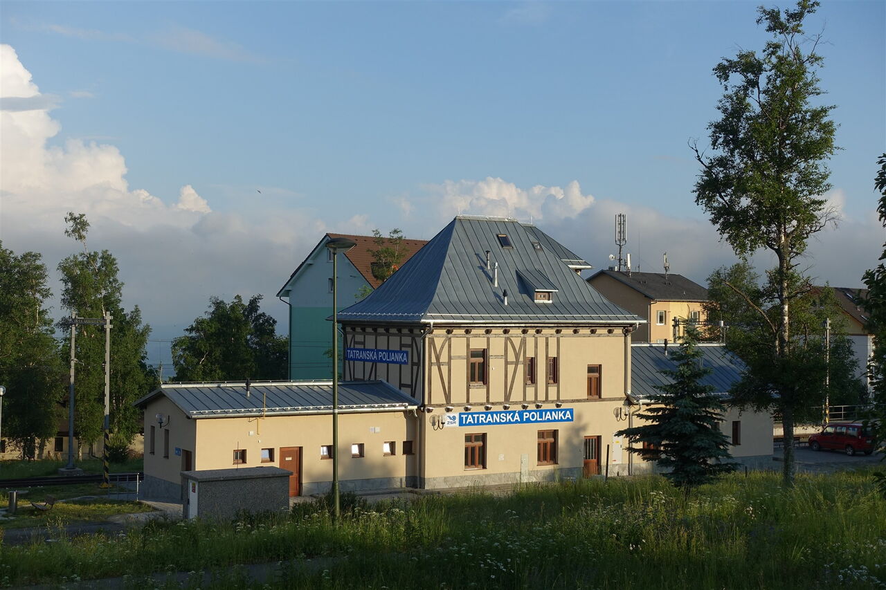 Direkt hinter einer Brücke und dem darauffolgenden überdachten Picknickplatz verlassen wir die asphaltierte Straße nach halb rechts und wechseln auf einen Pfad. Im weiteren Verlauf queren wir mehrmals die Straße. Bei einem Parkplatz gehen wir dann bis zur Hauptstraße herunter, queren diese und erreichen nach wenigen Metern bergab den Bahnhof 05 TEŽ Tatranská Polianka (941 m).