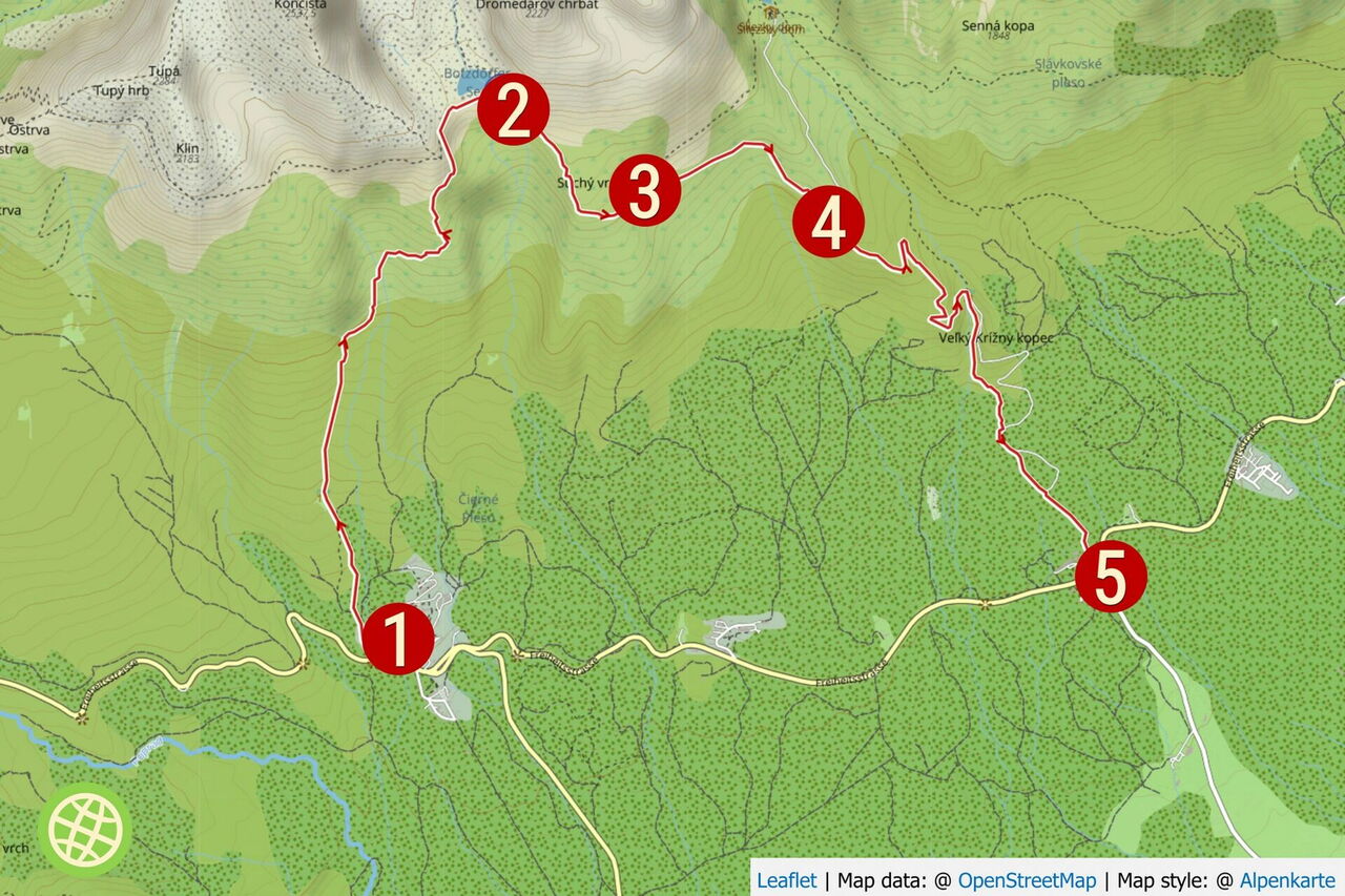 Der nachfolgende Pfad durch ein kleines Waldgebiet mündet beim 04 Rázcestie na Batizovskej Zákrute (1500 m) in die asphaltierte Straße, die Zufahrtsstraße zum Sliezsky dom.