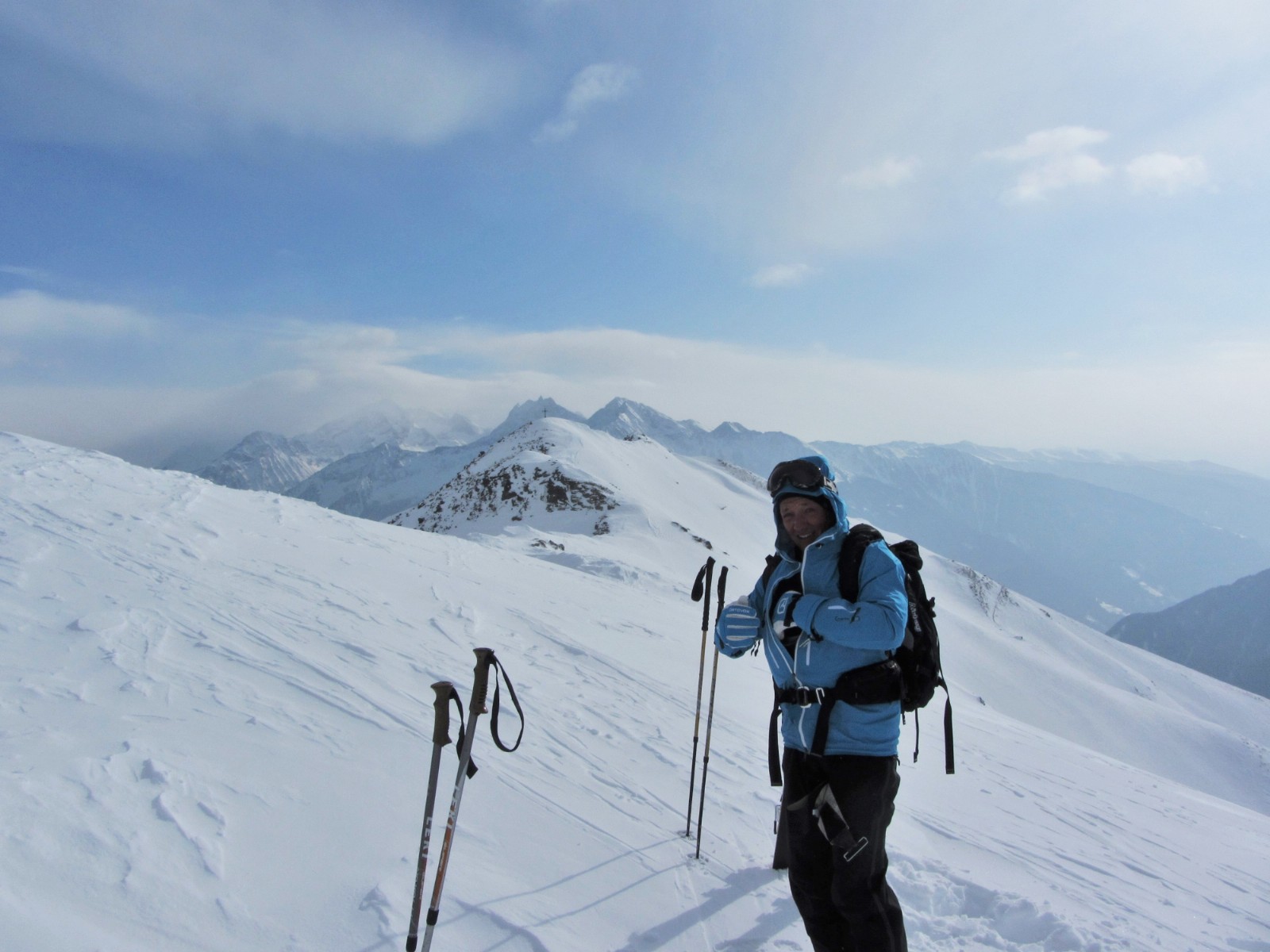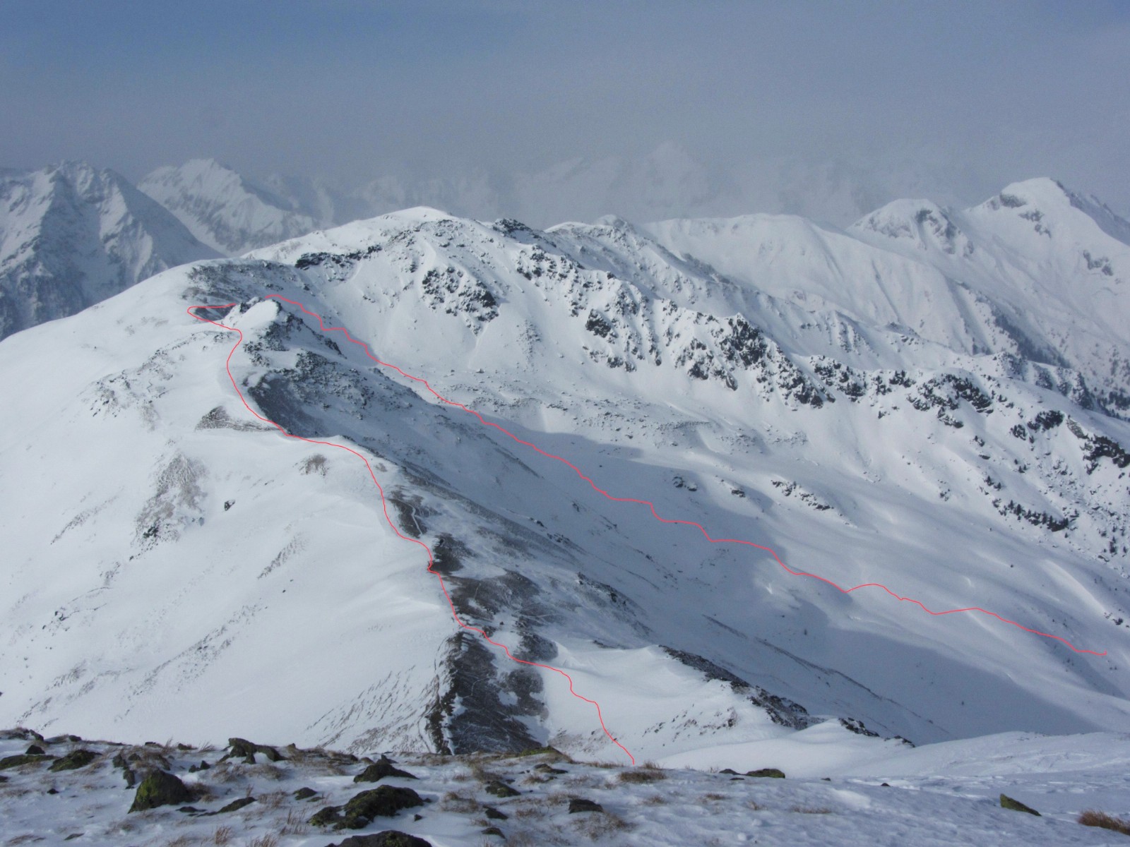 Beim Mühlwalder Jöchl geht es auf Fellen auf dem Kellerbauer Höhenweg, bis wir vor dem Gornerberg rechts ins weite Tal abfahren. Wir fahren ca. 1,6 km, bis es flacher wird.