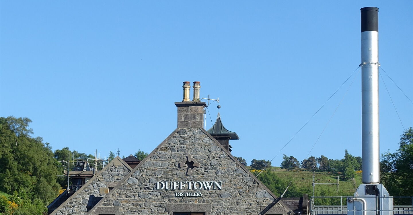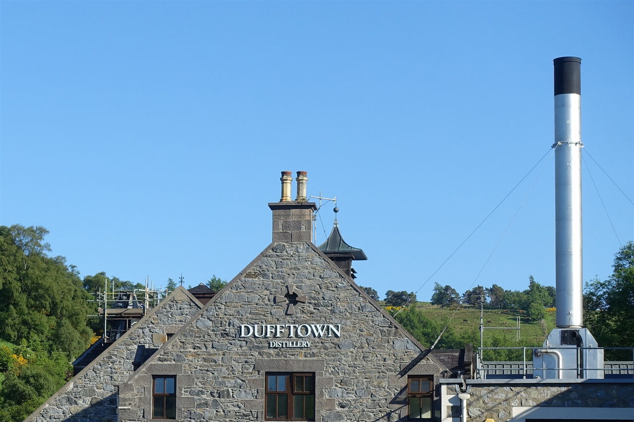 Nach 450 m verlassen wir die A941 und biegen rechts in die Straße Richtung 02 Mortlach Distillery (162 m) ab. Sie wurde 1823 gegründet und ist die älteste Whiskybrennerei in Dufftown. Wir gehen direkt zwischen dem alten denkmalgeschützten und dem neuen Trakt hindurch. Am Ende eines Wendeplatzes für Fahrzeuge und dem dunklen Gebäude gehen wir halb links auf der Schotterpiste leicht bergab. Hinter der Brücke über das Dullan Water gehen wir rechts, folgen dem Wegweiser Richtung Giants Chair, gehen anschließend über den Friedhof und queren nicht die Brücke. Dann sehen wir auf der anderen Uferseite die 1896 gegründete Dufftown Distillery. Sie wurde auf den Grundmauern einer Mühle erbaut und war zum damaligen Zeitpunkt die sechste Brennerei in dem doch so kleinen Ort Dufftown.