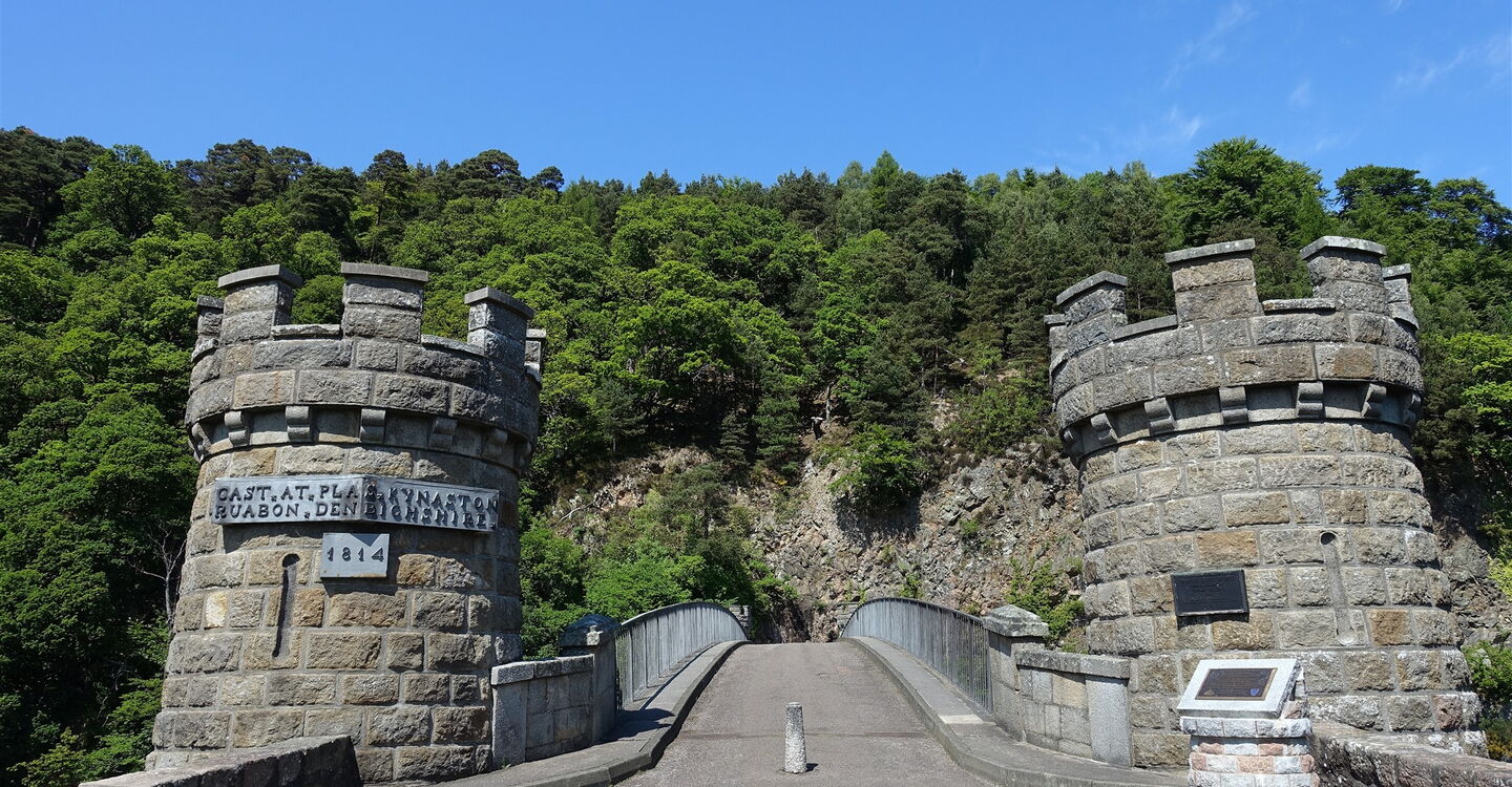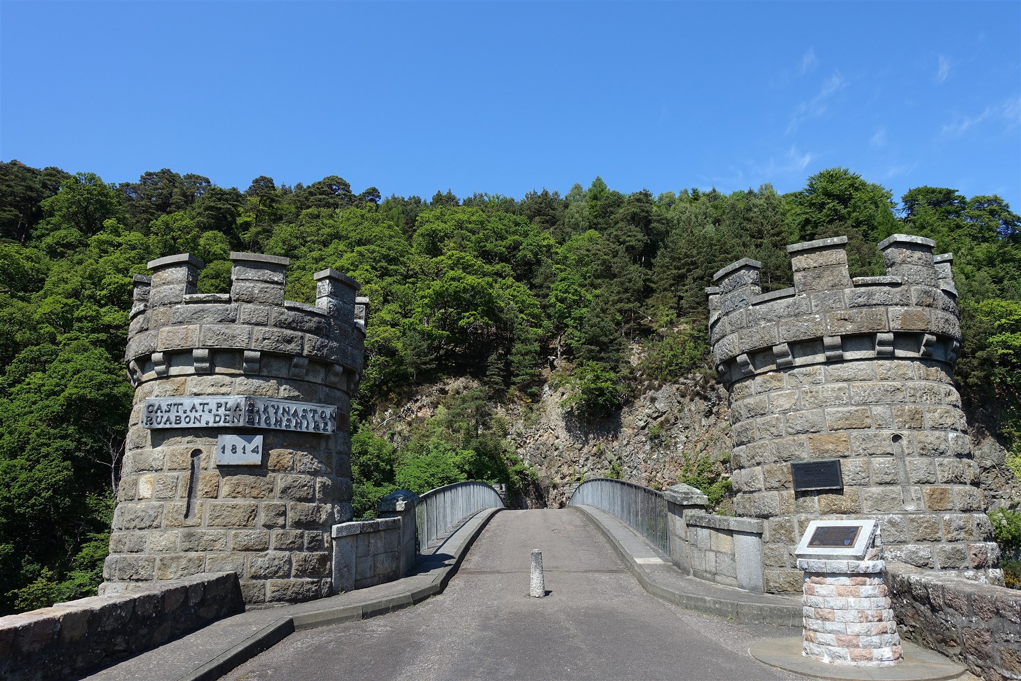 Wir gehen am Besucherparkplatz vorbei, ignorieren einen rechten Abzweiger, verlassen die Asphaltstraße in einer Linkskehre und gehen geradeaus auf der Piste, bis sie endet, um dann auf der Straße 525 m rechts zu gehen. An der Stelle, wo rechts die Leitplanke beginnt, befindet sich rechts ein Baum, um den ein türkises Band gewickelt ist. Hier steigen wir ab – aber auf keinen Fall gerade heruntergehen, denn dort befindet sich eine 30 m hohe Felswand! Wir queren den Berghang entlang von Steinmännchen und Straßenbegrenzungspfeilern auf einem schwer auszumachenden Pfad, der auf eine unterhalb liegende Straße stößt. Hier gehen wir auf der gesperrten Straße rechts und überqueren die 1838 fertiggestellte gusseiserne Bogenbrücke 03 Craigellachie Bridge (97 m).