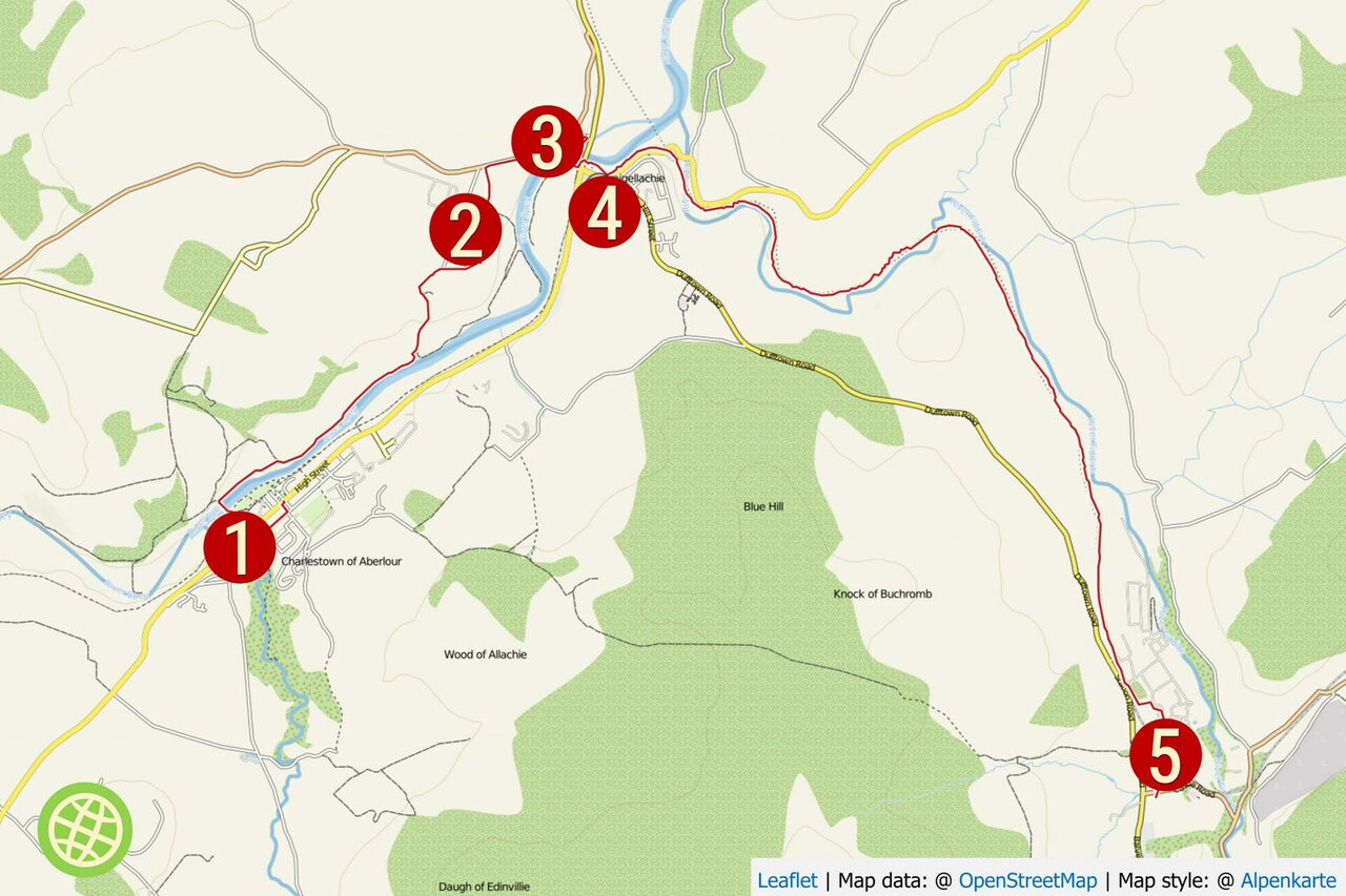 Pkw-Anfahrt: Der Start befindet sich 85 km nordwestlich von Aberdeen. Auf der A941 kommend, biegt man auf den ausgezeichneten riesigen Parkplatz der Glenfiddich Distillery ab. Geokoordinaten: 57.453291 -3.129365. Busfahrt zum Start: Wir nehmen die Buslinie 36 von der Bushaltestelle Dufftown, Glenfiddich-Whiskybrennerei bis zur Haltestelle Aberlour, The Square. Fahrzeiten: Montag bis Samstag von 9:26 bis 18:26 im Stundentakt. Die Fahrzeit beträgt 16 Minuten. Bitte klären Sie vor Ort die aktuellen Fahrzeiten. Hilfreich ist dabei die Webseite: https://www.stagecoachbus.com/routes/north-scotland/36/dufftown-square-elgin-bus-station/xaao036.o.