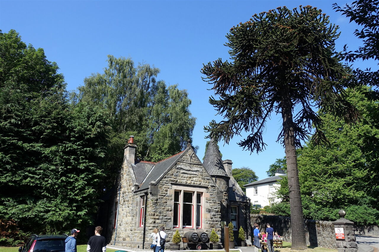 Beim großen Parkplatz an der Glenfiddich-Whiskybrennerei gehen wir bis an die Hauptstraße zurück und dort einige Meter links bis zur Bushaltestelle mit einer kupfernen Brennblase, die zur Destillation verwendet wird. Nach der Busfahrt erreichen wir die Ortschaft Aberlour. Wenn wir nicht zu früh aussteigen, sind wir bei dem großen Platz mit der dahinter liegenden Kirche. Direkt hinter dem Coop gehen wir links in die Queens Road und biegen bei der nächsten Möglichkeit rechts ab. Wir gehen am Ende der Straße bis an den Bach herunter, rechts bis zur Straße vor, links über die Brücke und abermals links bis zur 1826 gegründeten 01 Aberlour Distillery (95 m). Das Besucherzentrum befindet sich in einem urigen Steinhaus unter einer riesigen Norfolktanne.
