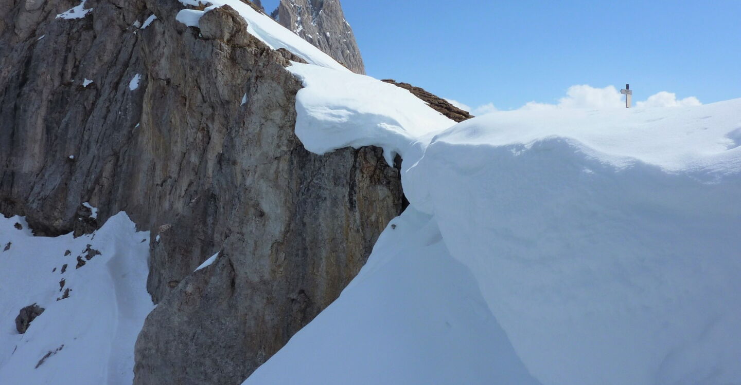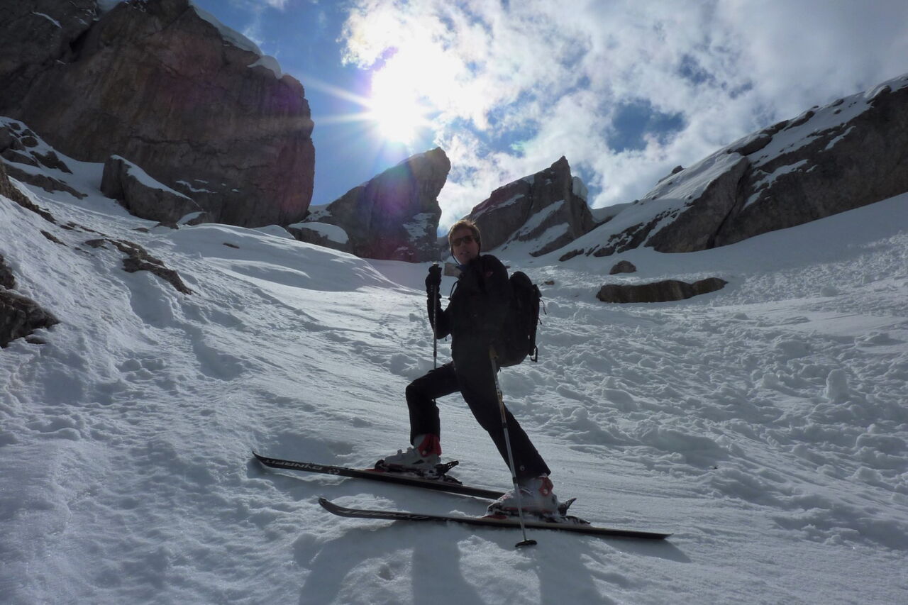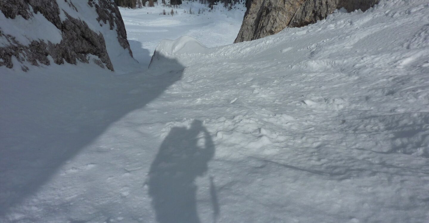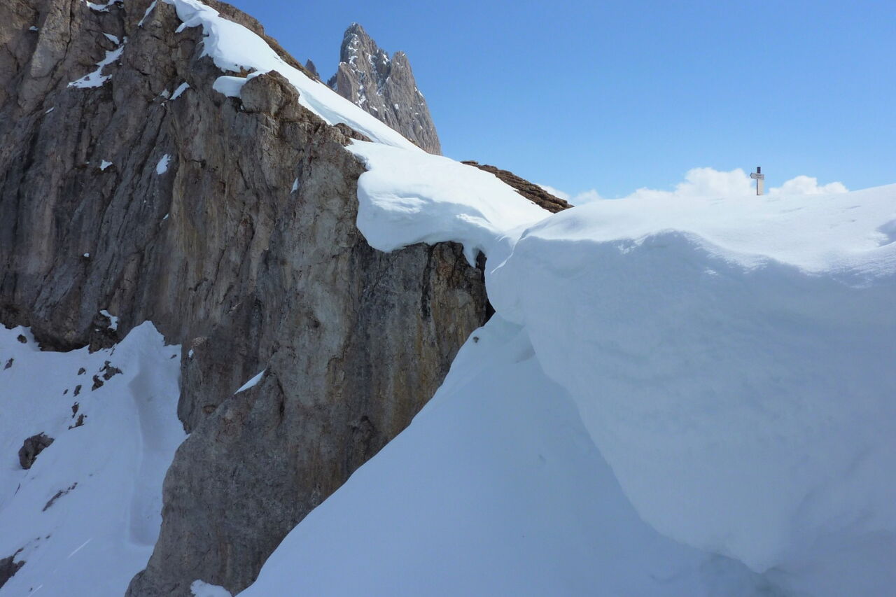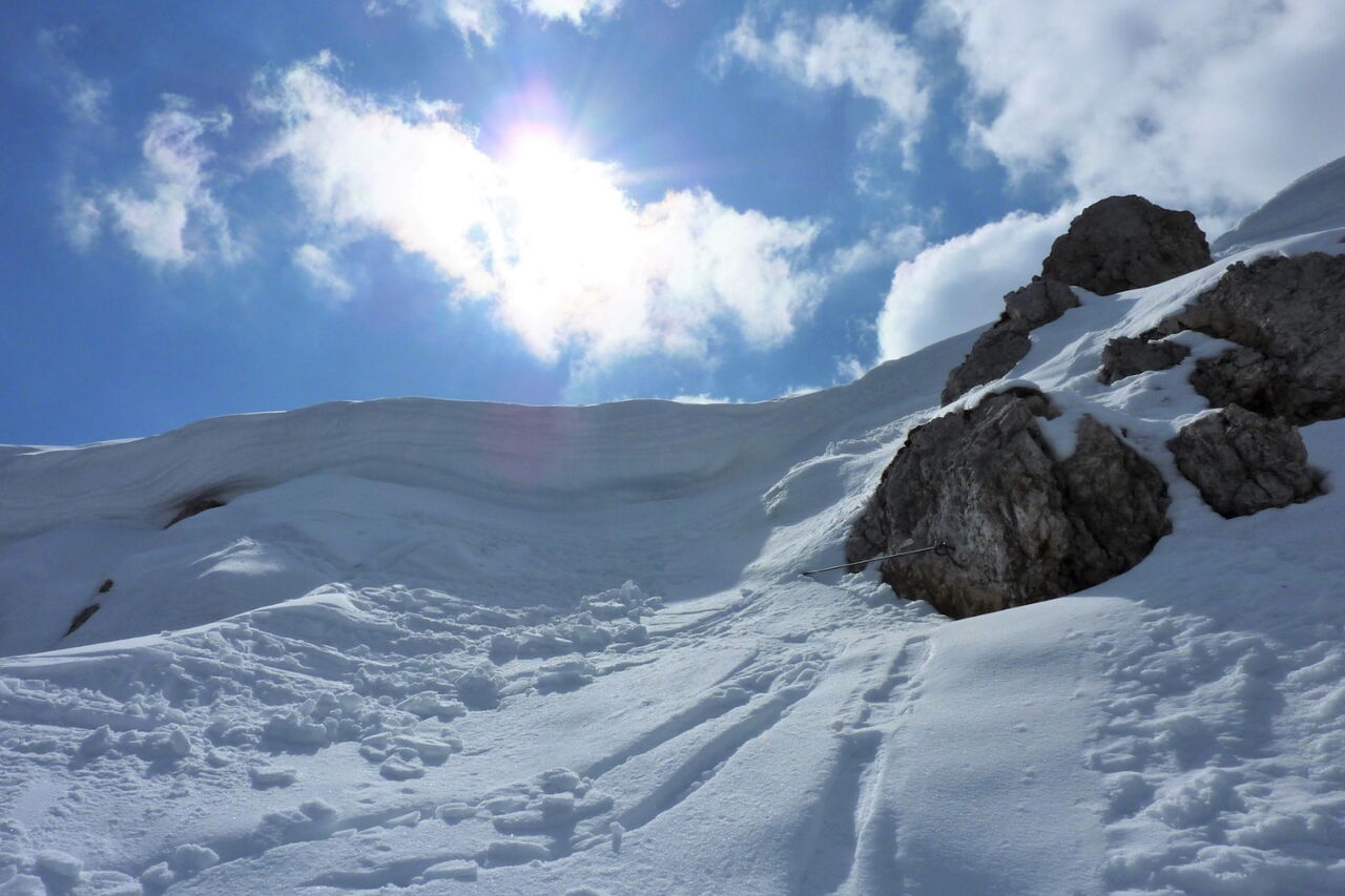 An der Bergstation des Lifts Nr. 8 Fermeda fahren wir 700 m in östlicher Richtung, den Hang querend, wo wir beim Einstieg in die Scharte eine 2 bis 3 m hohe Schneewechte überwinden mussten.