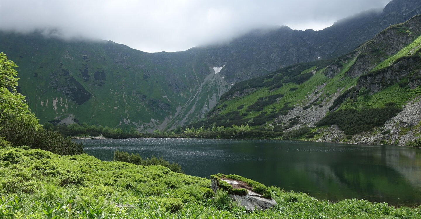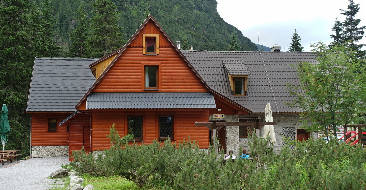 Den darauffolgenden rechten Abzweiger lassen wir aus und gehen geradeaus weiter. Wir erreichen die idyllisch am Ťatliakova-See gelegene 02 Ťatliakova Chata (1316 m). Sie ist in der Zeit vom 15. Juni bis 30. Oktober bewirtschaftet. Ein geräumiges Esszimmer mit Kamin lädt zum Verweilen ein. Noch vor der Hütte zweigt halb links der ausgezeichnete Pfad Richtung Roháče plesá ab. Dieser führt etwas oberhalb des ersten Sees entlang. Links oberhalb (Richtung Osten) auf dem Bergrücken befindet sich die Tour 75 – im Grenzgebiet zwischen der Slowakei und Polen.