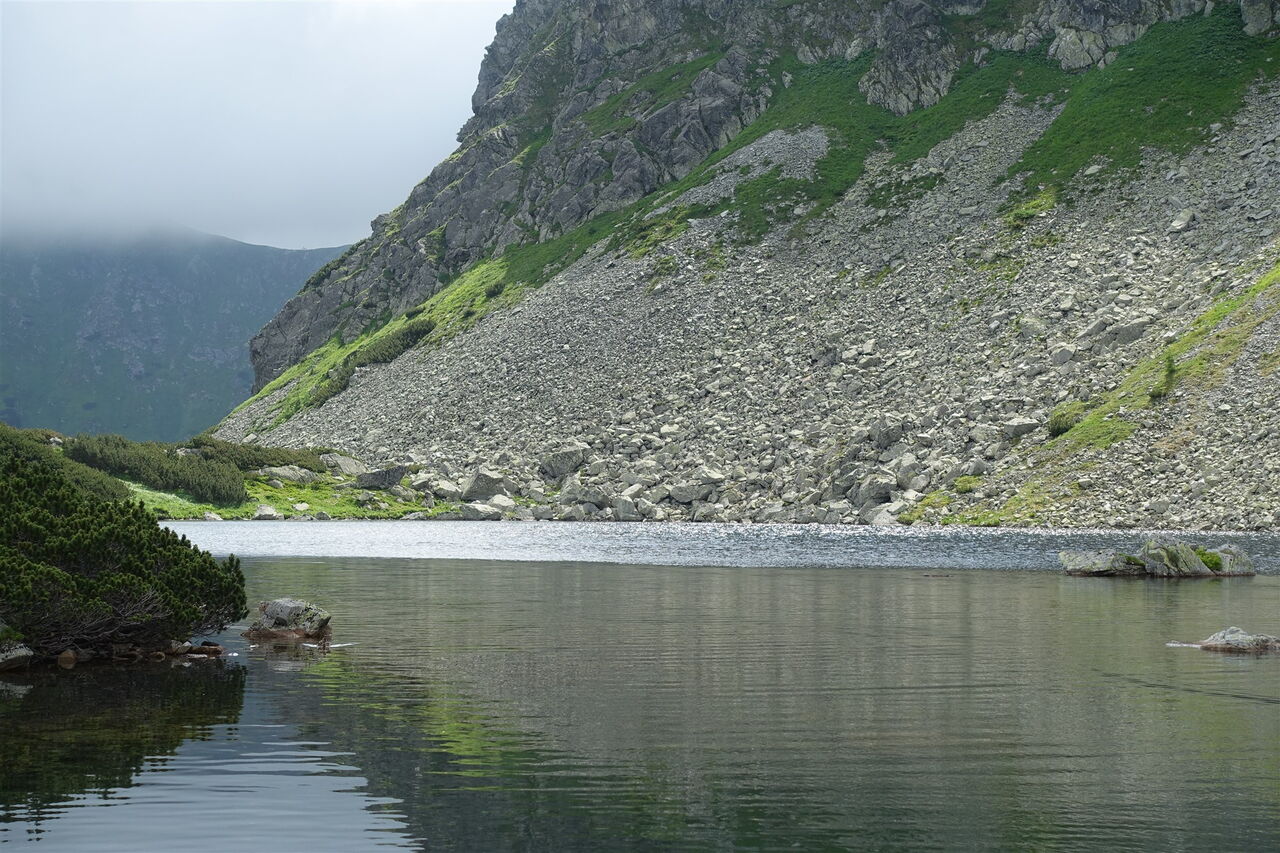 Auf einem angelegten Pfad steigen wir weiter auf und kommen am dritten, vierten und letzten der 04 Roháče plesá (1683 m) vorbei. Wir haben den höchsten Punkt der Tour erreicht, von nun an geht es steil und in engen Kehren auf einem blau ausgezeichneten Wanderweg talwärts. Wir ignorieren den linken Abzweiger Richtung Žiarska Chata (siehe Touren 31 und 32).