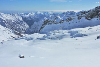 Viele Varianten für Traumtiefschneeabfahrten unterhalb vom felsigen Punta Strahling.