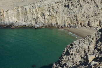 Sehr schwieriger Abstieg zu einem Schmugglerstützpunkt östlich von Khasab und Rückfahrt mit einem Schnellboot.