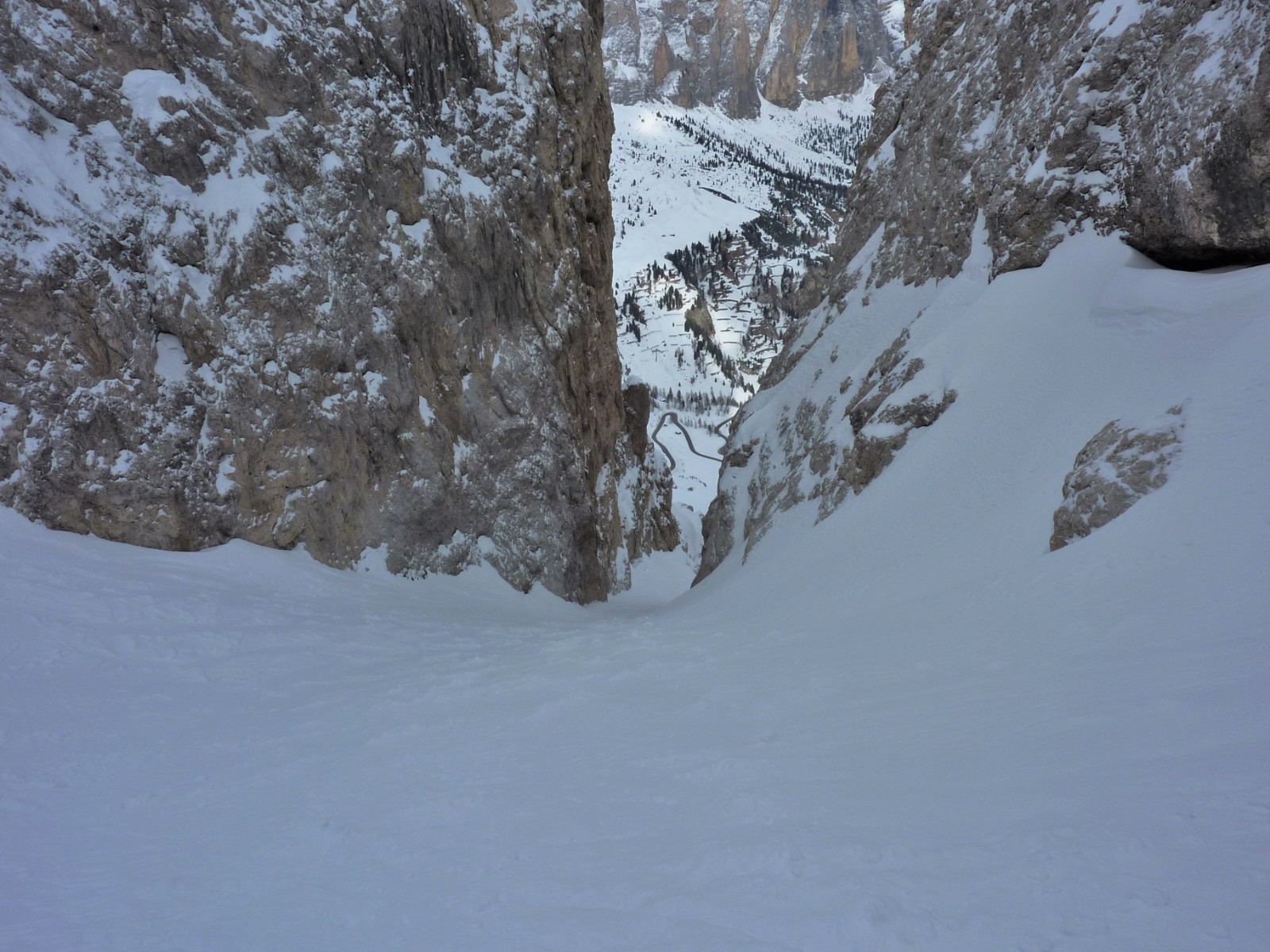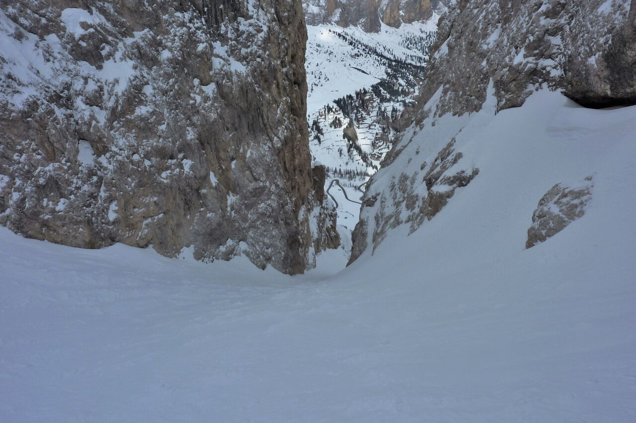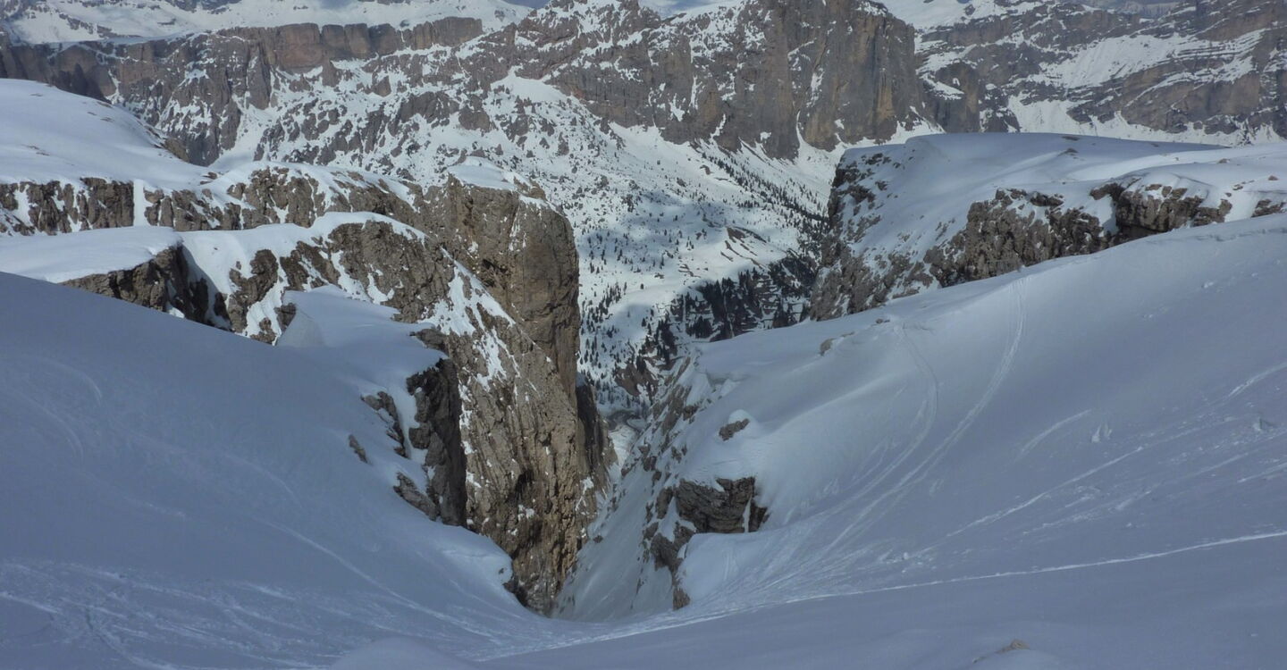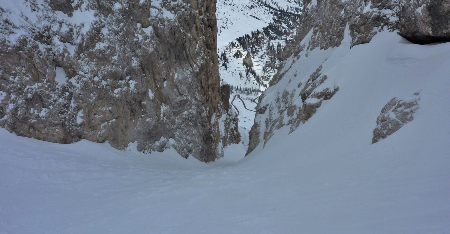 Wenn noch keine Spur vorhanden ist, ist die Orientierung nicht einfach, aber mithilfe des GPS-Tracks gut machbar. Die Abfahrt führt über einen Nordhang. Folgende Ausrüstung wird empfohlen: Produkte für alpine Sicherheit im Schnee, Tourenski und Skitourenhelm. Es empfiehlt sich die Einkehr in das Rifugio Maria bei der Bergstation, welches nach Maria Piaz, der Pionierin des Tourismus am Pordoipass, benannt wurde. Beste Jahreszeit: Januar bis April. Uns erwarten kurze Stücke mit bis zu 50° Hangneigung.