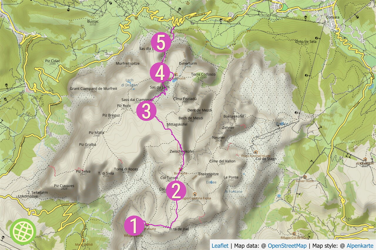 Geokoordinaten zum Start 46.550617 11.856117. Sie führen Dich nach Corvara, wo Du das Auto parkst und mit dem Lift weiterfährst.