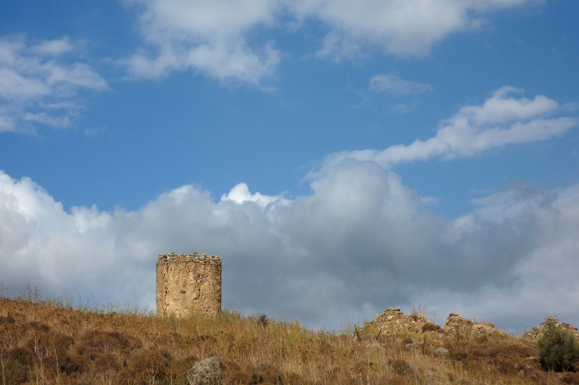 Dort gehen wir links, direkt hinter der Leitplanke sofort wieder links und erreichen die 05 Antike Stadt Lyttos (616 m). Sie gehörte zu den ältesten und mächtigsten Städten auf Kreta – ein Erzfeind von Knossos. Geht man noch an der Kirche vorbei, dann rechts an den Weinreben ein kurzes Stück den Abhang hinunter, so findet man die Überreste. Wir gehen auf dem weiterführenden Weg an der Kirche Agios Georgios vorbei, über den Bergrücken und weiter in Richtung einzeln stehender Türme. Aber bevor wir diese erreichen, biegen wir halb links auf die Schotterpiste ab. Auf dem betonierten Stück gehen wir rechts und sofort wieder links, sodass wir die Hauptstraße in Littos erreichen. Wir folgen dieser in einem großen Halbkreis um das Dorf herum. In einer Rechtskehre mit einem Verkehrsspiegel verlassen wir die Hauptstraße nach links bergauf. Wir tangieren kurz die Hauptstraße und gehen nun direkt nach Kastelli hinunter und bis zum Dorfplatz vor, wo wir 100 m rechts gehen und der Ausschilderung zum Hotel folgen.