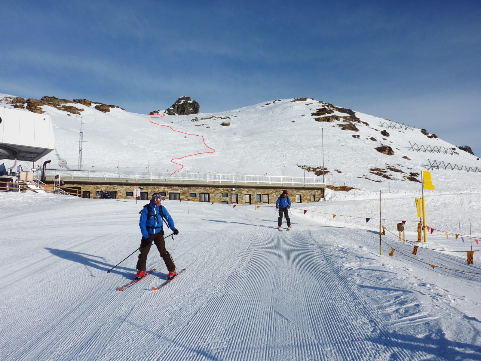 Mit ein bisschen Geschiebe kommen wir zur Bergstation des Sessellifts Nr. 32 Pianalungs Bocchetta und so wieder ins Skigebiet zurück.
