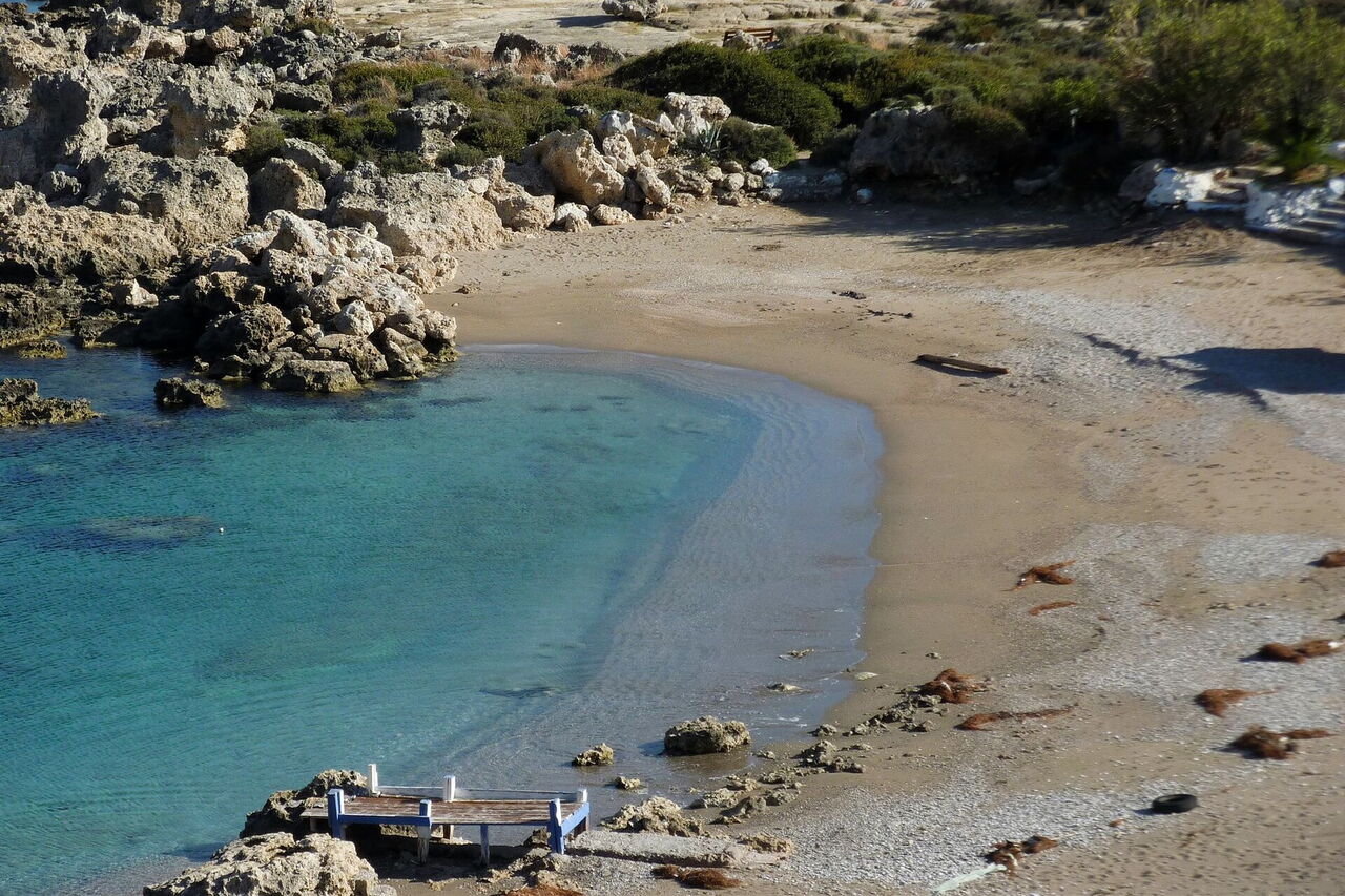 Bereits nach einem kurzen Stück erreichen wir die wunderschön gelegene (02) Anthony-Quinn-Bucht (27 m). Sie ist sehr populär und besonders im Sommer dementsprechend sehr voll. Von sanften Hügeln umgeben befindet sich hier ein malerischer Strand mit feinem Sand und kleinen Steinen, der seicht in das kristallklare und saubere Wasser führt. Man findet hier die komplette touristische Infrastruktur vor: Liegestühle, Sonnenschirme, Duschen sowie Tavernen und Cafés. Am linken äußersten Ende des Parkplatzes verlässt ein schmaler Pfad die Bucht, der mit einem Wegweiser Richtung Faliraki gekennzeichnet ist.