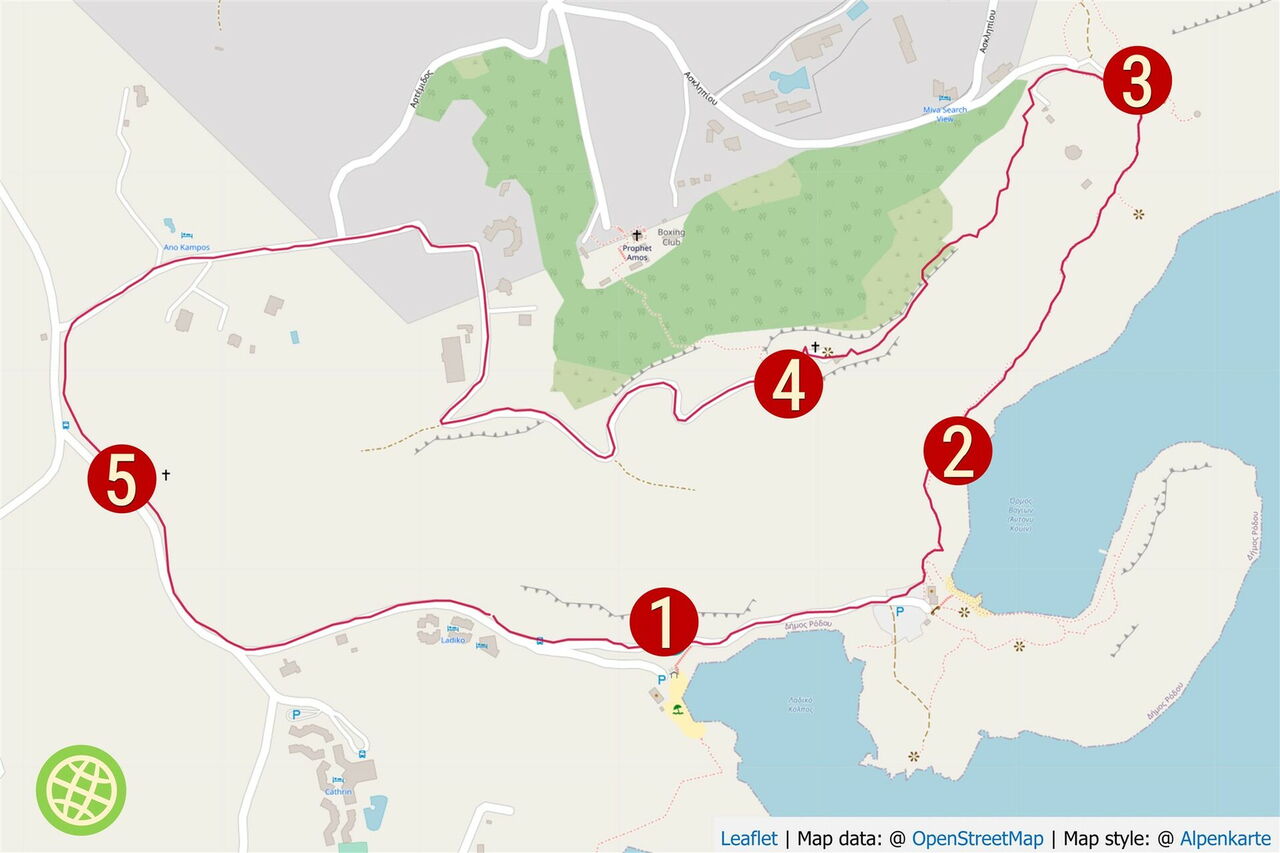 650 m führen über ein wegloses und inzwischen stark verwachsenes Teilstück. Auf diesem Stück ist die Orientierung nicht einfach, auch erwartet uns eine leichte Felskletterei. Art des Weges: 50 % Asphaltstraße, 30 % Pfade und 20 % weglos. Ausrüstungsempfehlung: Wanderstöcke und lange Hose. Einkehr: Hotel Ladiko sowie die Tavernen am Strand von Ladiko. Beste Jahreszeit für diese Tour: April bis Oktober. Variante: Wandert man nur bis zum Wegpunkt 3, den Hipparchos Apartments, genießt dort die traumhafte Aussicht und geht auf dem gleichen Weg zurück, so ist der Schwierigkeitsgrad dieser Wanderung blau.