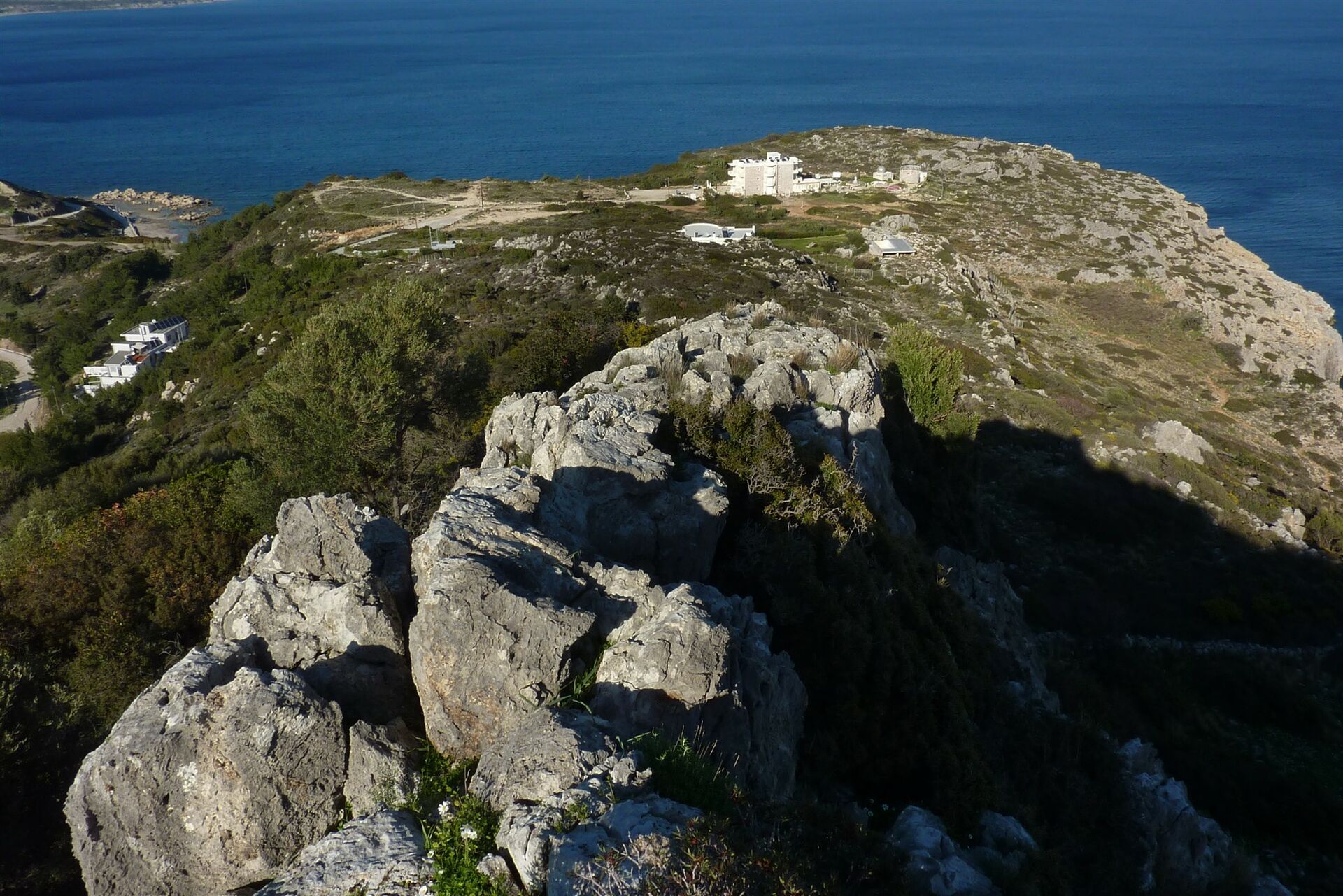 Entlang eines Maschendrahtzauns und über eine Ebene erreichen wir schon bald die (03) Hipparchos Apartments (130 m). Nach einem kurzen Stück parallel zur Zufahrtsstraße der Apartments gehen wir bei der folgenden Weggabelung links in Richtung der alleinstehenden Villa, um dort bei den Oleanderbüschen zunächst rechts auf einem Pfad parallel zum Maschendrahtzaun aufzusteigen. Der folgende kurze, aber knackige Aufstieg hat es in sich. Der Pfad verliert sich, auf dem weglosen Stück orientieren wir uns in Richtung der vor uns liegenden Felsnase. Nach einer Ebene wird das Buschwerk so dicht, dass wir uns rechts der Felsnase halten müssen, bis wir schlussendlich nach 50-60 m einen Pfad finden, der direkt auf den felsigen Grat zuführt. Wir steigen nun in luftiger Höhe direkt auf dem Grat hinauf, bis wir den Gipfel erreicht haben.