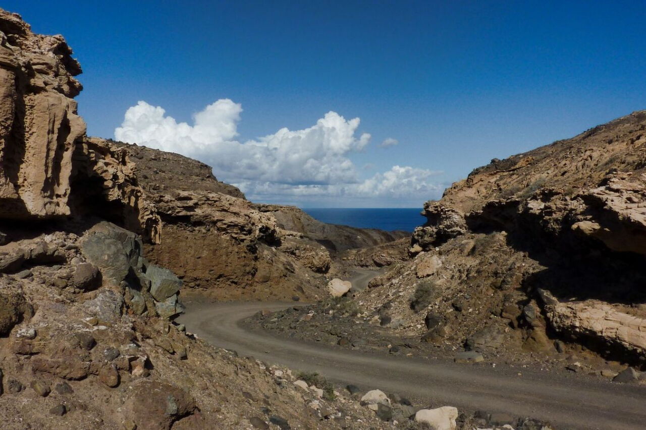 Busanbindung: keine. Mit dem Pkw fährt man 38,5 km von der Costa Calma zum Start. Wir fahren auf der FV-2, bis wir oberhalb des Hafens rechts Richtung Playa Cofete abbiegen. Beim rechts von uns liegenden Friedhof beginnt die Schotterstraße. Bei der Abzweigung – links geht es Richtung Faro de Jandia und Puertito de la Cruz – fahren wir rechts weiter Richtung Playa de Cofete. Exakt 2,4 km nach dem Aussichtspunkt Degollada de Agua Oveja zweigt links eine Schotterstraße zum Meer ab. Hier befindet sich eine kleine Parkbucht. Geokoordinaten Parkplatz: 28.092567 -14.416733.