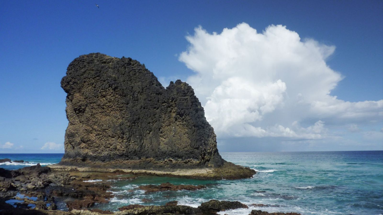 Bei Niedrigwasser ist der Strand gute 150 m breit. Wir gehen nun links in Richtung der 36 m hohen Felsformation, dem (04) Roque de Moro (6 m). Wie lässt sich dieses Phänomen erklären? Was wir vor uns sehen, ist das erstarrte Magma, welches nicht ausgeworfen wurde. Im Laufe der Jahrtausende hat die voranschreitende Korrosion das weichere Gestein abgetragen und nur die erstarrte Felssäule stehen lassen.