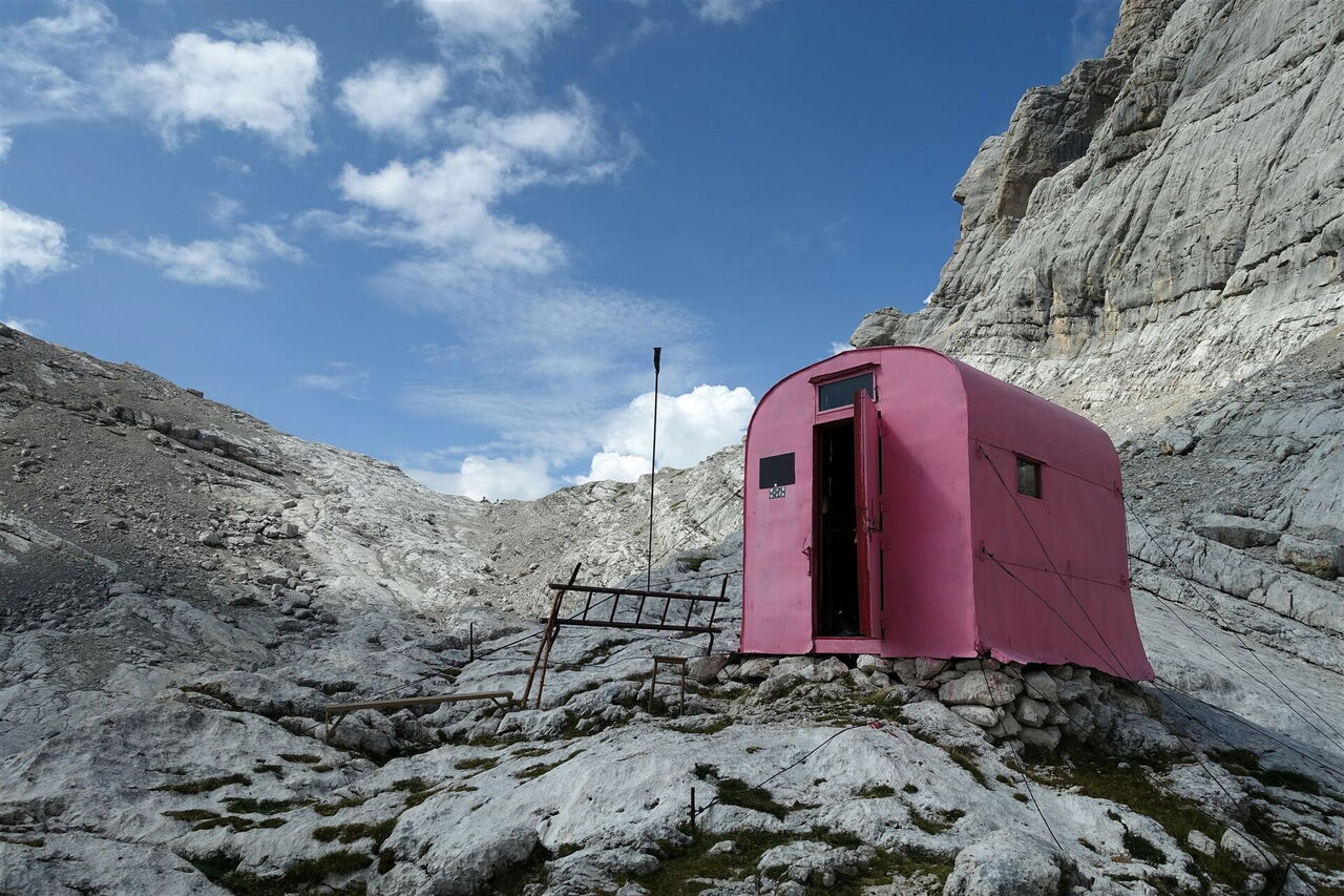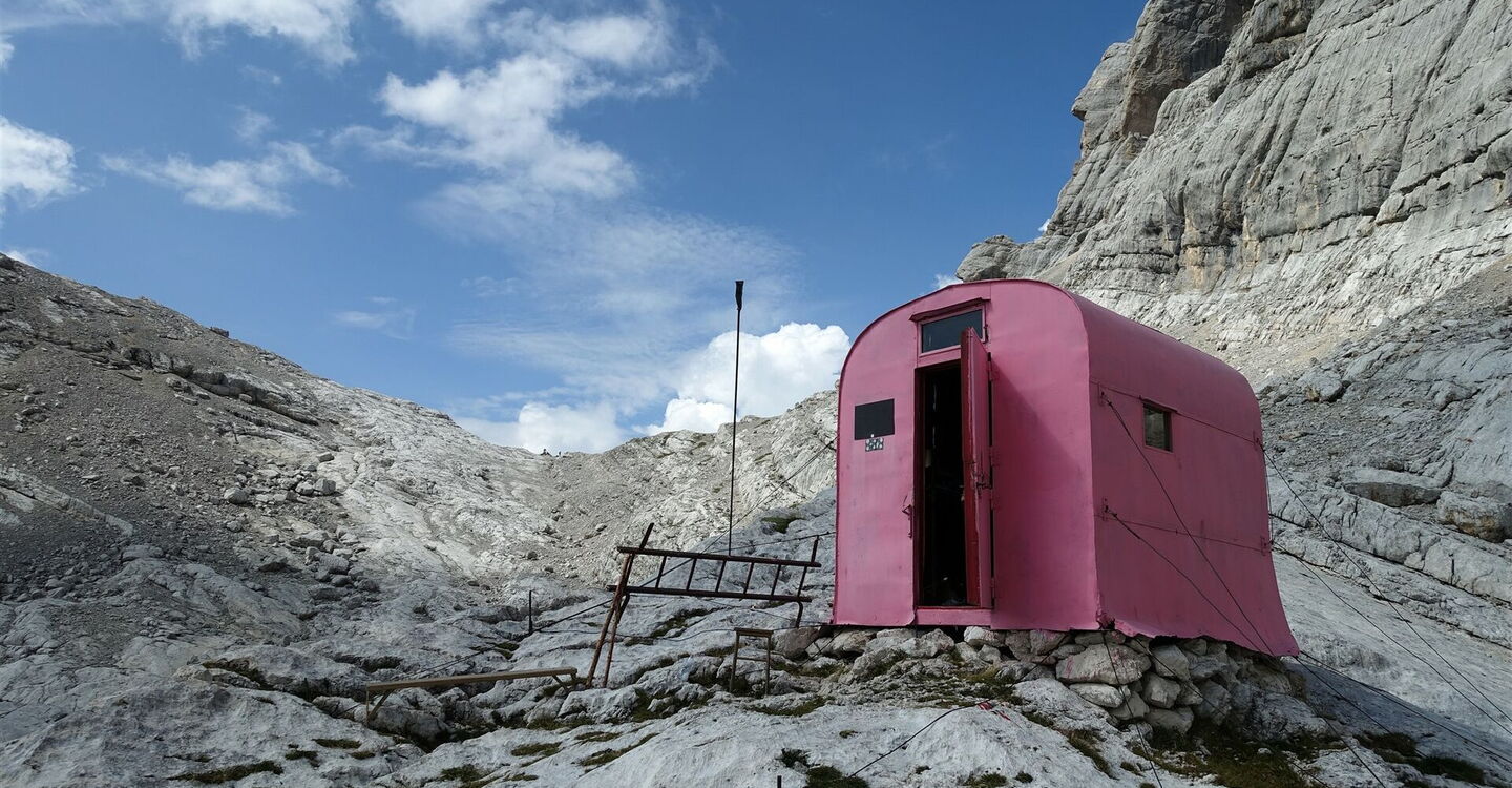 Vom 01 Bivacco Slataper (2.600 m) folgen wir dem bergab führenden Wanderweg 246. Er führt ein kurzes Stück in östlicher Richtung in das riesige Kar zwischen dem 3.002 m hohen Monte della Caccia Grande und dem 3.005 m hohen Punte Tre Sorelle.