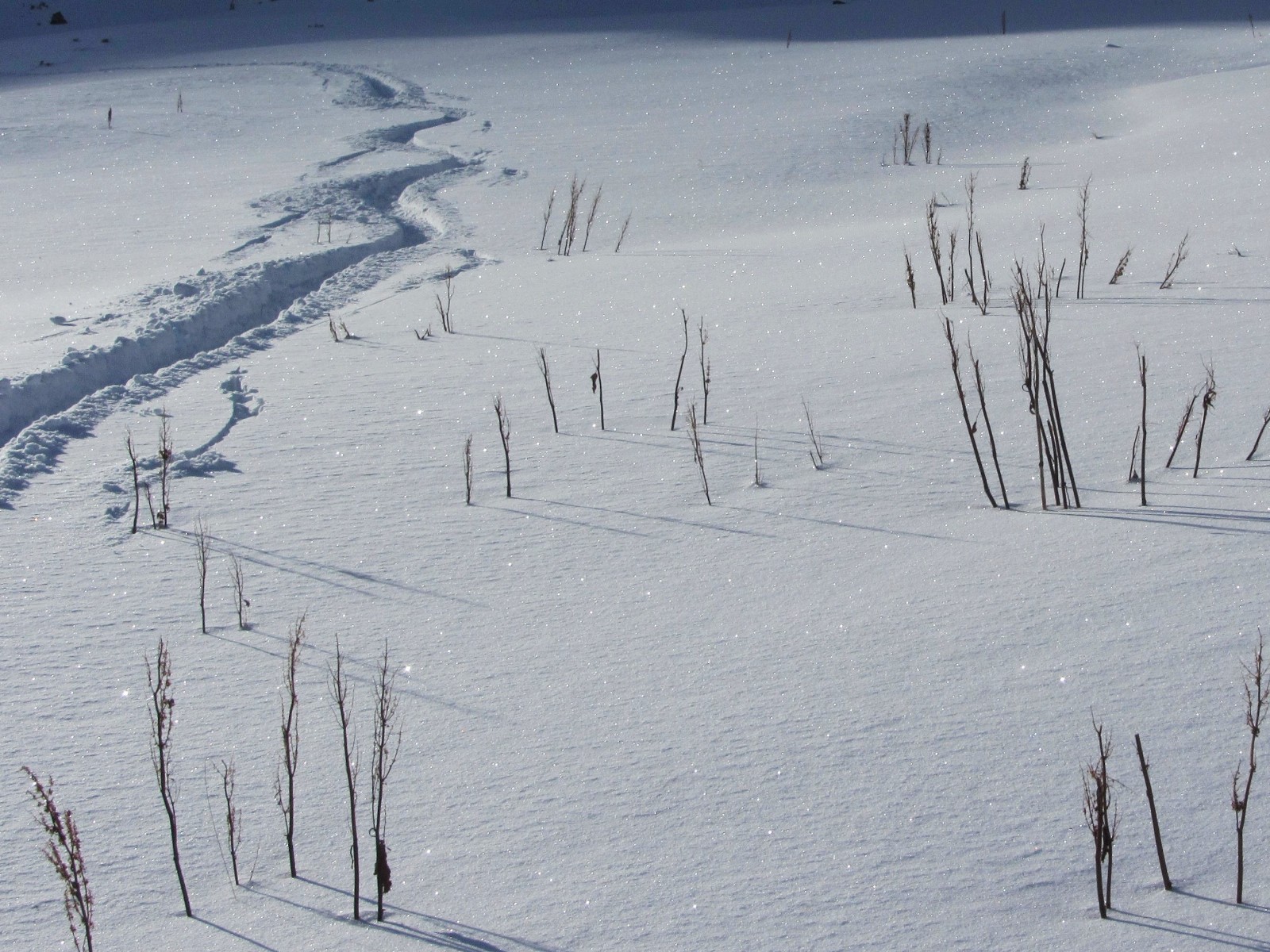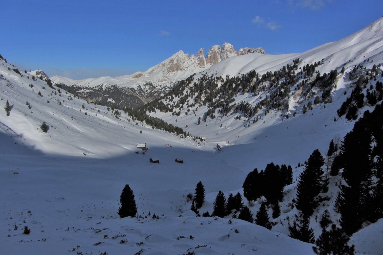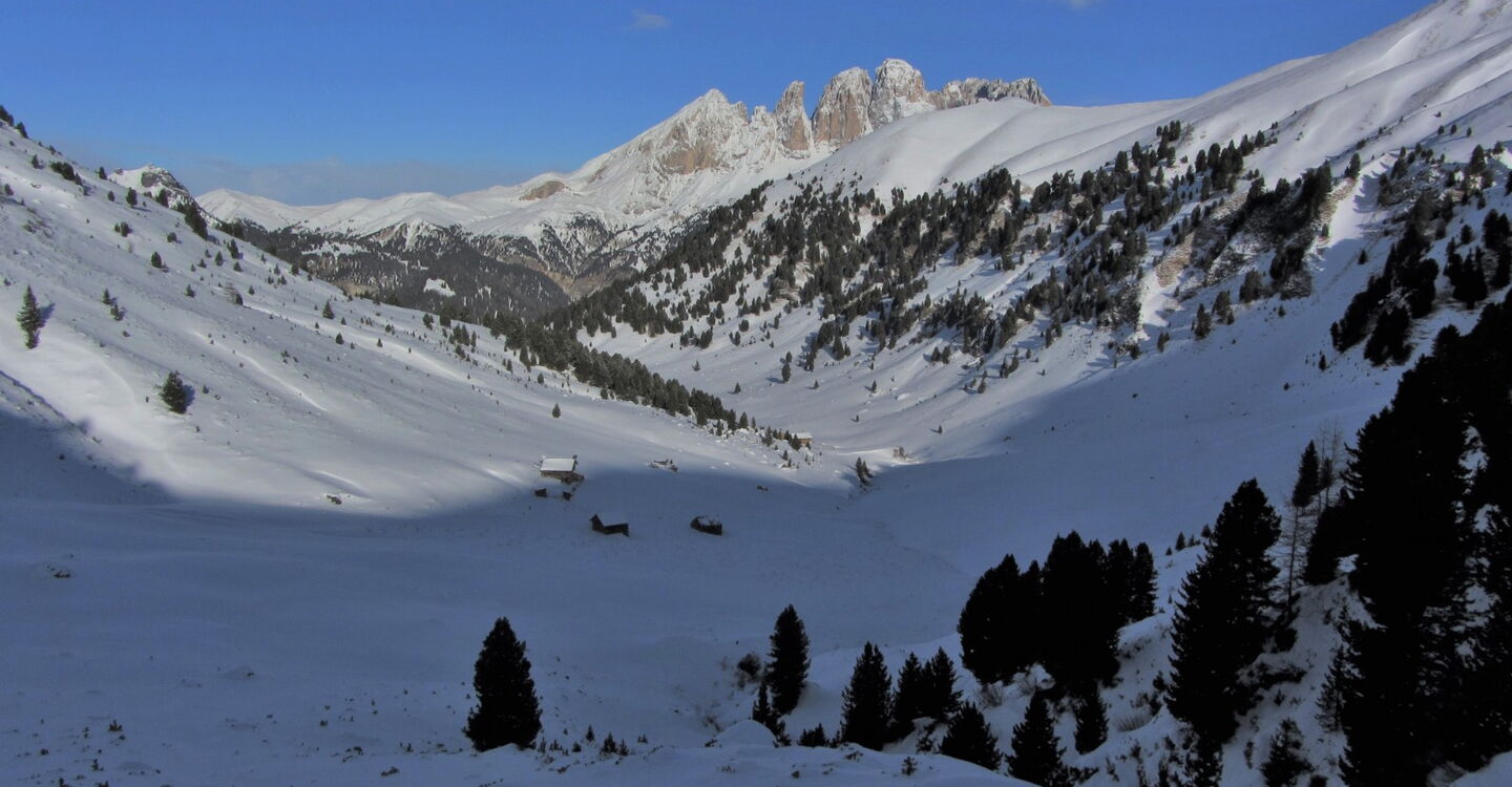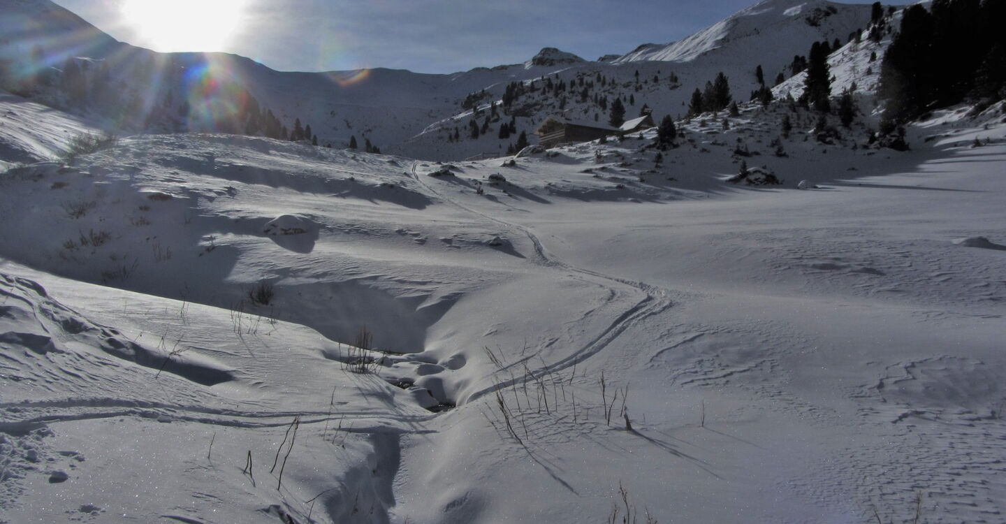 Diese Tour kann nur bei genügend Schnee bis ins Tal gemacht werden! Nach ein paar Almhütten und kurzen Schiebestücken treffen wir auf den Wanderweg nach Fontanazzo.