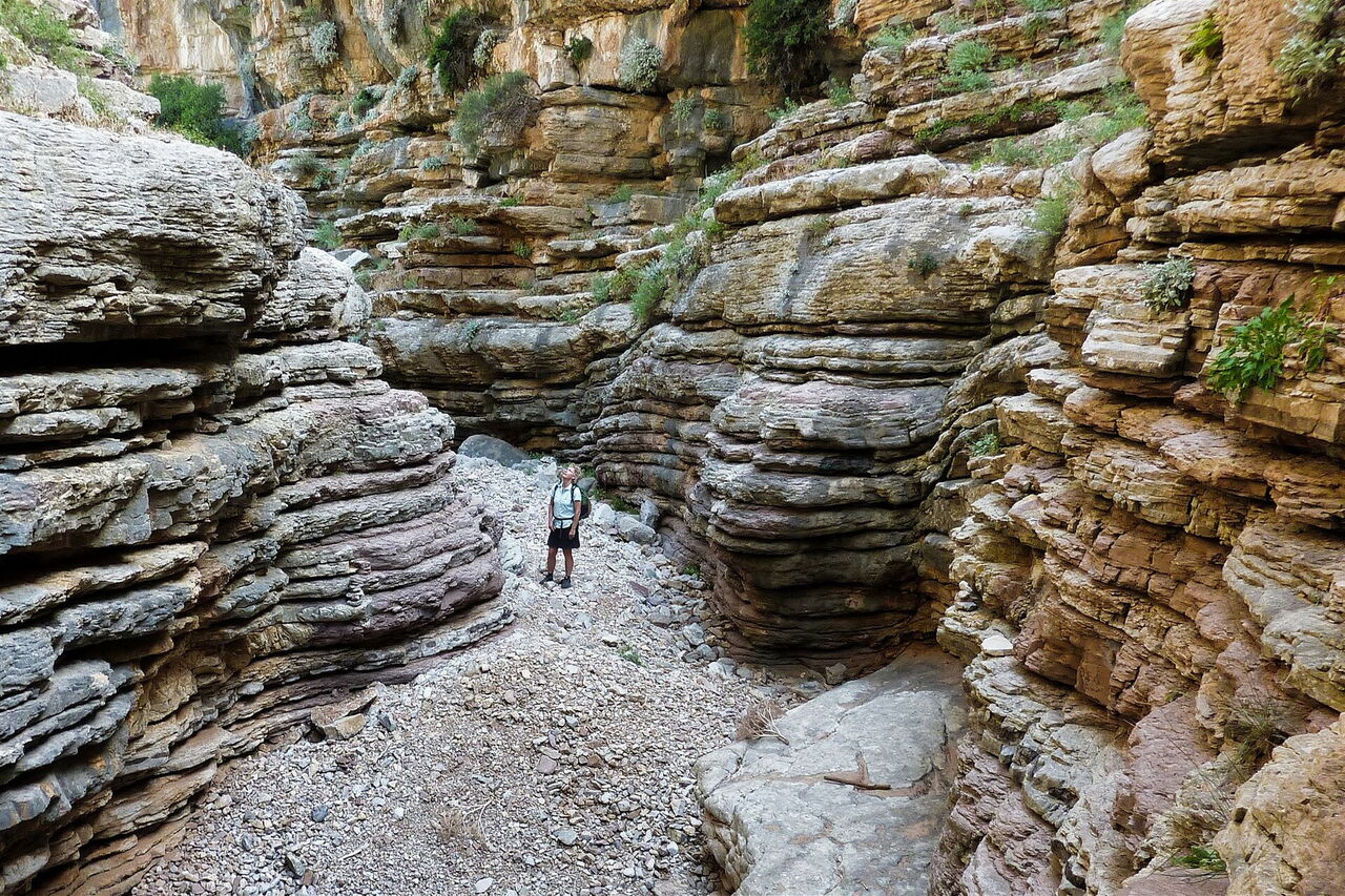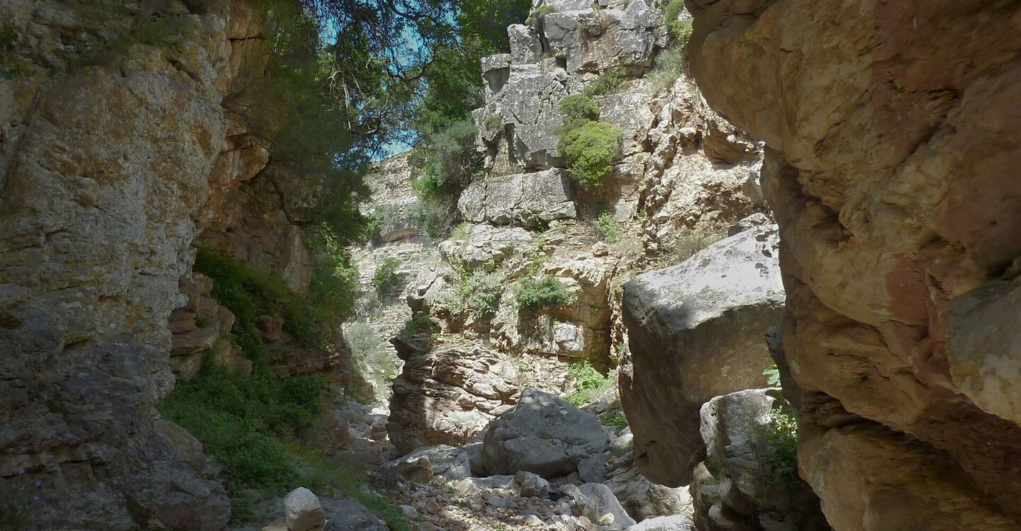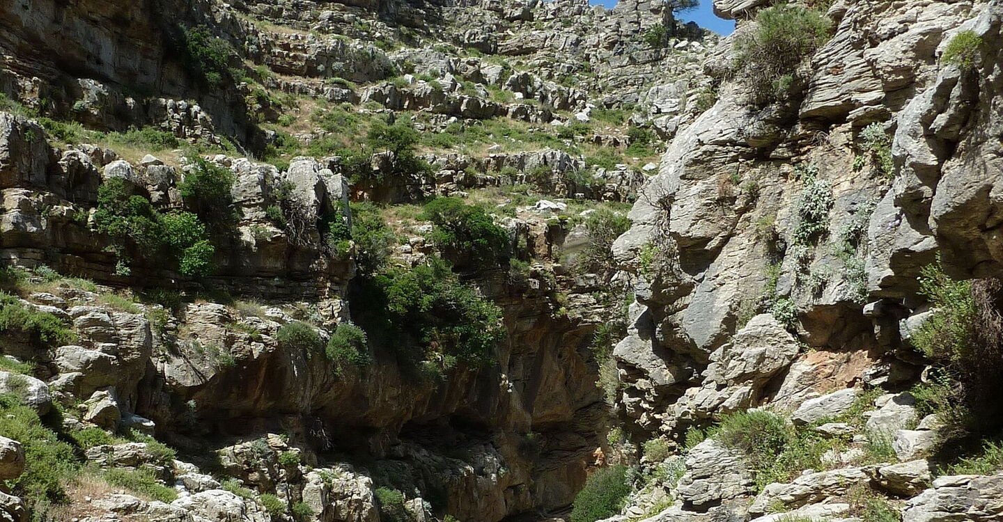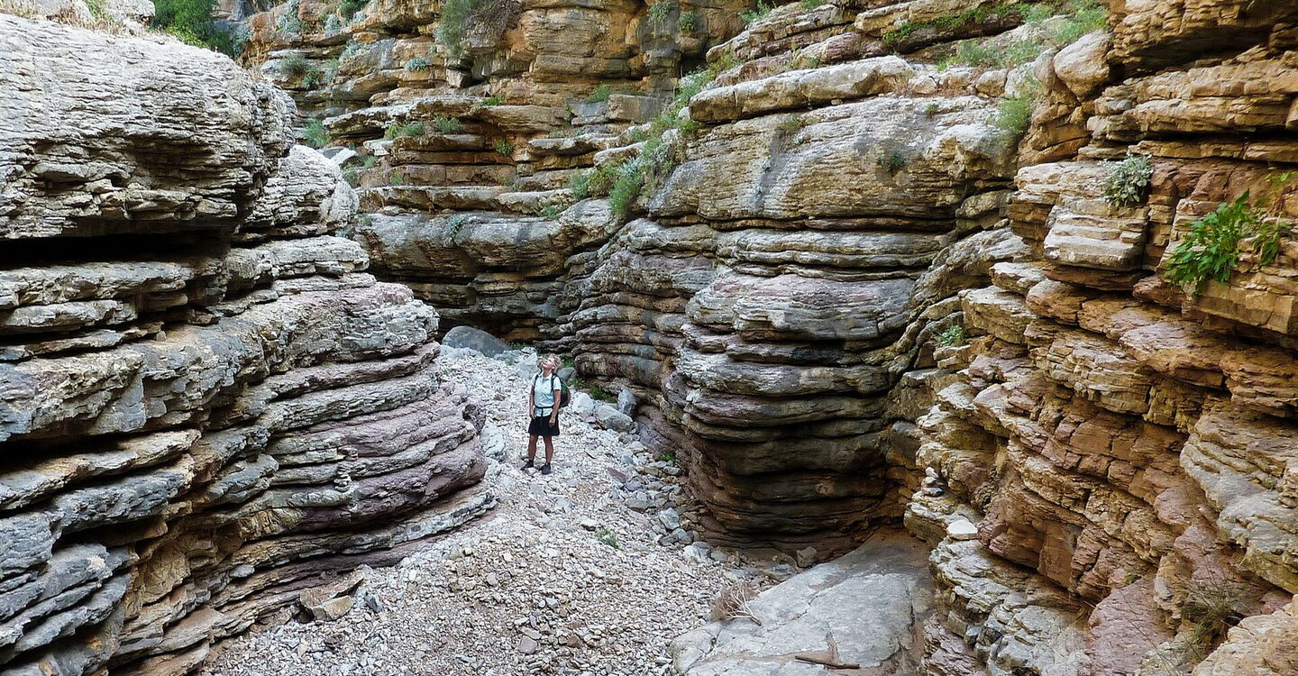 Das landschaftsprägende Attaviros-Gebirgsmassiv im mittleren Westen von Rhodos hat zwei mächtige Schluchtausläufe. Vom Hauptgipfel, dem Attaviros, endet der längste Schluchtauslauf, Richtung Osten, unterhalb des Dorfes Agios Isodoros. Richtung Westen, zwischen dem Attaviros-Hauptgipfel und dem Nebengipfel Voskotopi, schlängelt sich der Canyon Plouma Richtung Meer – unser heutiges Projekt. Aber diese Durchwanderung des Canyons, bei der man eigentlich mehr am Klettern als am Wandern ist, erfordert unsere vollste Aufmerksamkeit und ist sehr schweißtreibend. Auf der Wanderung erzählt die Natur die schönsten Geschichten: eine eindrucksvolle Schlucht mit bis zu 200 m senkrecht aufsteigenden Felswänden, den stufenförmig geschichteten Gesteinsschichten und einem nur 3 m engen Nadelöhr.